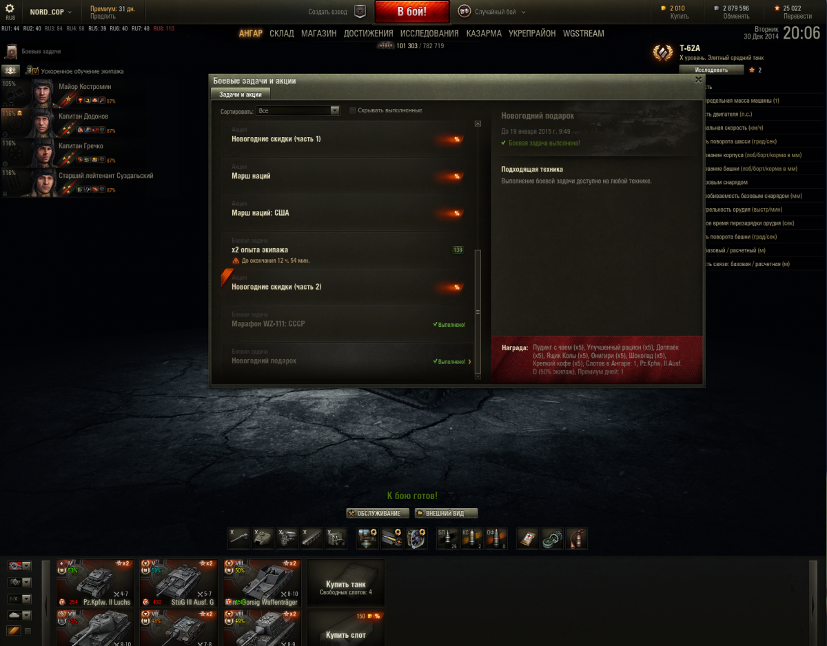 Выполнена боевая задача новогодний подарок, однако в ангаре акционный танк Pz.Kpfw. II Ausf не отражается. В чем может быть проблема? Боевая задача отмечена, как выполненная.