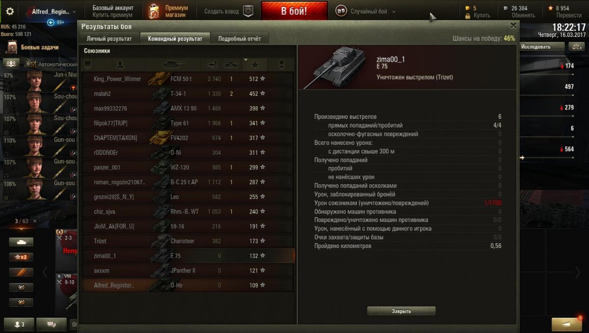 Вот сейчас выехал на убогом O-Ho, карта Топь. Тока отъехал и вообще без причин получил от ползущего позади союзного Е 75 голдой в корму. Ну написал, что он рахит, чтоб знал. В ответ получил ещё два снаряда, после чего Е 75 поголубел, но упорно продолжал отстреливаться. Вопросы: 1. Почему он смог сделать аж 4 выстрела? Может смог бы ещё пальнуть, но его быстренько отправили отдыхать в ангар. 2. Почему у него опыта по итогам боя больше, чем у меня?? Я проехал аж на 0.1 км больше, чем этот пособник врага(он ехал позади и видно ещё останавливался, чтоб точнее выцелить) и никого не трогал(ток раз успел выстрелить, но когда его уже перекрасили). http://cdn-frm-eu.wargaming.net/wot/ru/uploads/monthly_03_2017/post-7696557-0-31681300-1489678823_thumb.jpg http://cdn-frm-eu.wargaming.net/wot/ru/uploads/monthly_03_2017/post-7696557-0-36037200-1489678836_thumb.jpg З.Ы. и 3. Почему у Е 75 по итогам не -1? Кто пишет про фотошоп - идите лесом, обычные скрины.