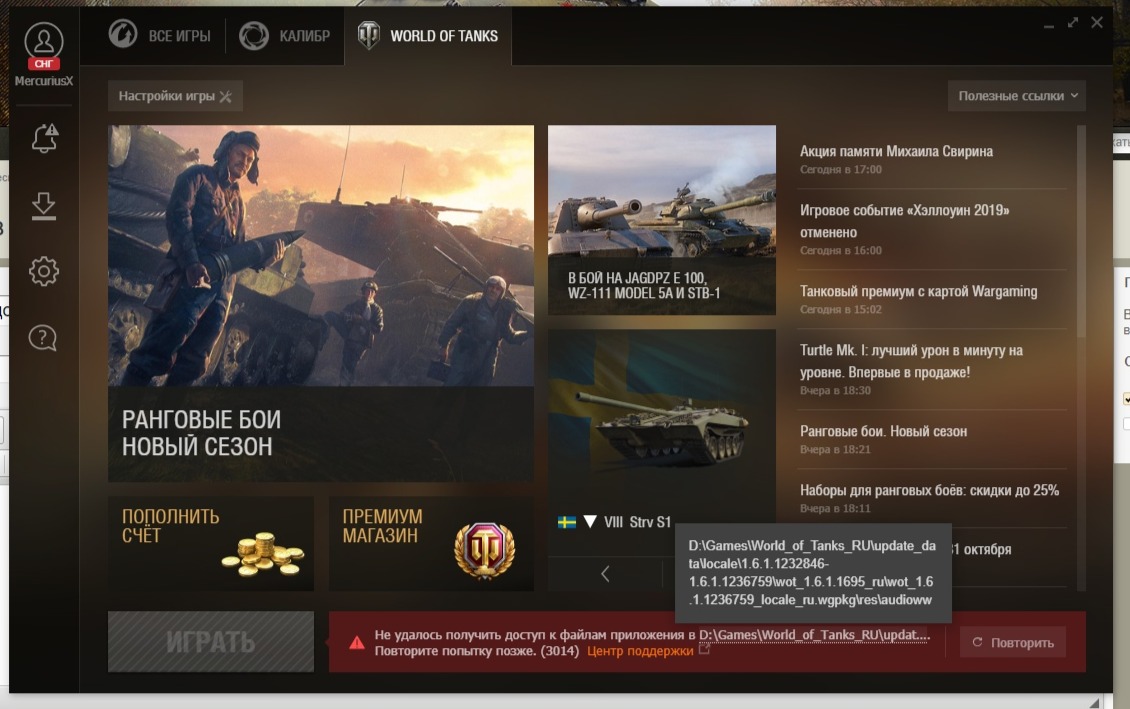 5. http://cdn-frm-eu.wargaming.net/4.5/style_images/wg/snapback.pngkoljan_86 (31 окт 2019 - 19:08) писал: Убедитесь, что на диске, на который вы устанавливаете не менее 40 гб свободного места. Проверьте, есть ли у вас доступ и права для папки, в которую устанавливается игра. Перезапустите компьютер (чтобы удалить временные файлы и остановить активные процессы). Проверьте, есть ли ограничения в используемом антивирусном программном обеспечении и брандмауэре. Чтобы исключить возможные проблемы с антивирусом и брандмауэром, можно временно отключить их и повторить проблемную операцию. Также отключите их на маршрутизаторе или другом используемом сетевом оборудовании. Отмените установку обновления и заново запустите от имени администратора.На диске больше 40гб места Доступ и права для папки есть. Я же до этого как-то заходил в игру) Ограничений нет, антивирусов нет, брандмауэр отключен Отменял и запускал заново, менял названия папок и прописывал путь самостоятельно, полностью удалял игру... ничего не помогло.