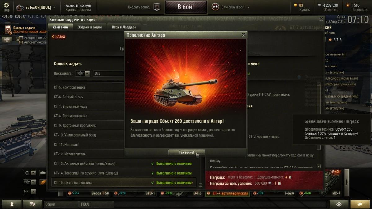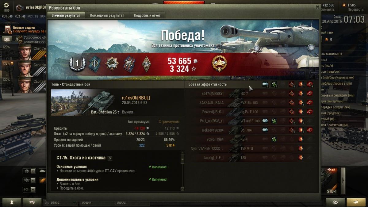 Вот и все об.260 в ангаре ПТ не стал проходить,засел на 12 задаче,а про 15 и думал перестал СТ-15 выполнил на бате в течении 25-30 боев,очень повезло с сетапом http://wotreplays.ru/site/7863974#top-ru1esok-bat_-ch_tillon_25_t http://cdn-frm-eu.wargaming.net/wot/ru/uploads/monthly_04_2016/post-7781235-0-85189800-1461125447_thumb.jpghttp://cdn-frm-eu.wargaming.net/wot/ru/uploads/monthly_04_2016/post-7781235-0-55228200-1461125451_thumb.jpg Всем удачи ребят!!!