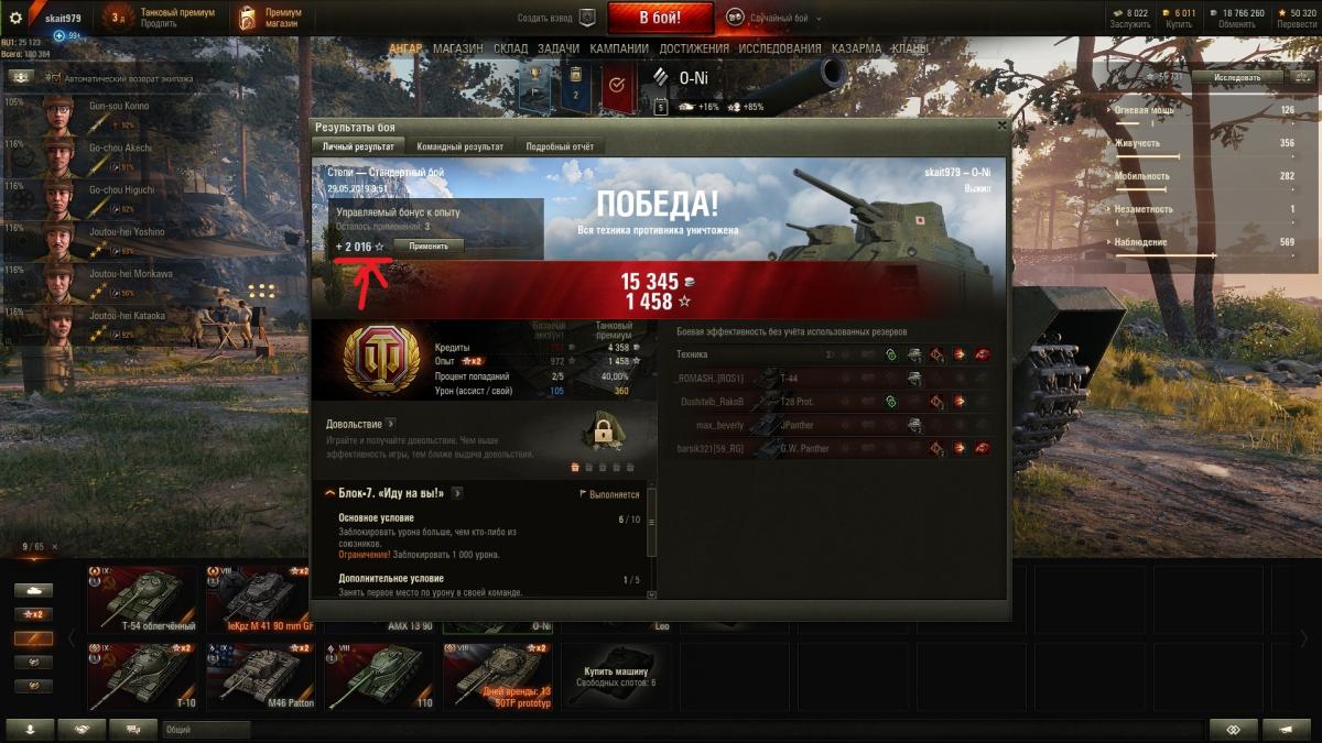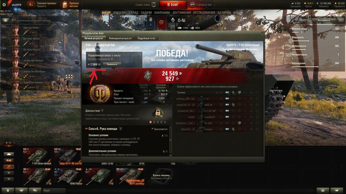 4. Подскажите пожалуйста, Почему когда только отыгран первый бой на технике и сняты звёзды, управляемый бонус к опыту применяется на опыт с премиум аккаунтом? А после, Когда обычная победа (не звёзды), я хочу применить управляемый бонус к опыту, но х-3 применяется к количеству опыта заработанного не с премиум аккаунтом, а базовым. Хотя прем активен. Вот пример на скринах. O-Ni Сняты звёзды, и можно применить х-3 (2016 опыта), что видно на скринах, и соответствует х-3 (672 опыта) в подробном отчёте боя. В столбике танковый премиум. Т-54 облегчённый, просто победа, и можно применить х-3 (1584 опыта), что видно на скринах, и соответствует х-3 (528 опыта) в подробном отчёте боя. В столбике базовый аккаунт.