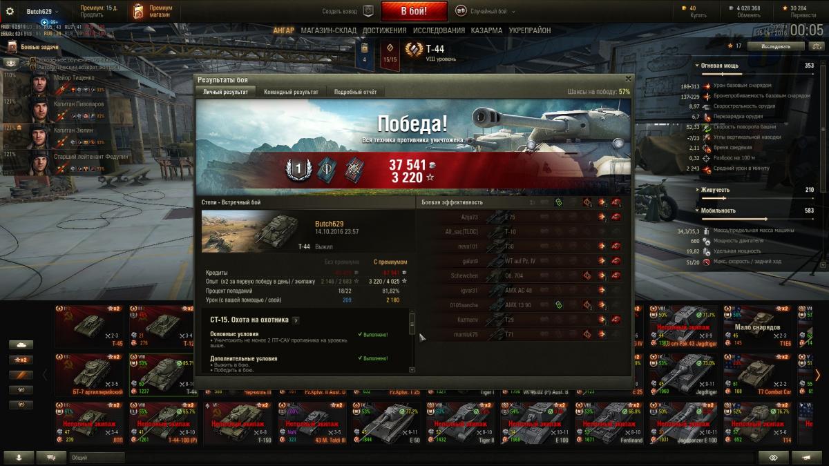 Наконец-то после 4 месяцев мучений (выполнял раз 6, но без отличия на 34-100, Чи-то, е-50, вз120 но как-то до конца боя выжить не удавалось) а тут на тебе даже перевыполнил