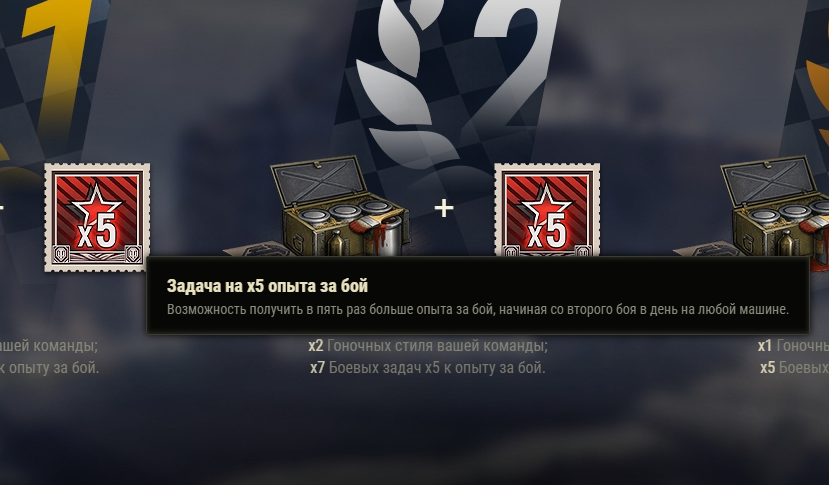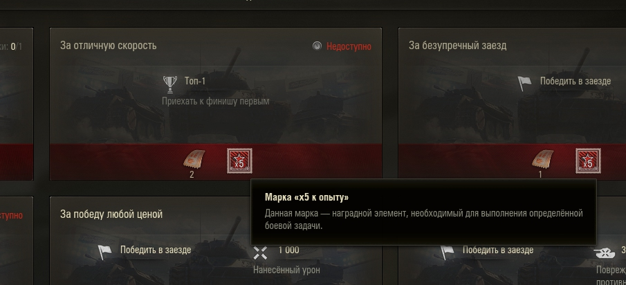 http://cdn-frm-eu.wargaming.net/4.5/style_images/wg/snapback.pngBouncer_13 (23 сен 2019 - 22:29) писал: Сначала зарабатываешь в гонках 4 марки , потом в рандоме (случайном бою) за эти марки ,если попадаешь в топ 10 дают Х5 опыта... Вообщем я понял...У ВГ явно с формулировкой проблемы...Нашел в клиенте вот это и сразу все встало на свои места.Можно закрывать!