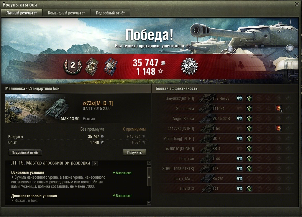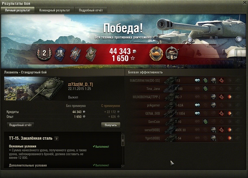 ТТ 15 сделал с отличием на ИС7. Натанковал 8060, настрелял 2549, плюс своего хп отдал около 1600. Да еще насветил 4000 :-) Т55 в ангаре. Самые затратные по количеству боев задачи у меня: поджог 2 танков на Ст и ЛТ15- 9 121 ответ