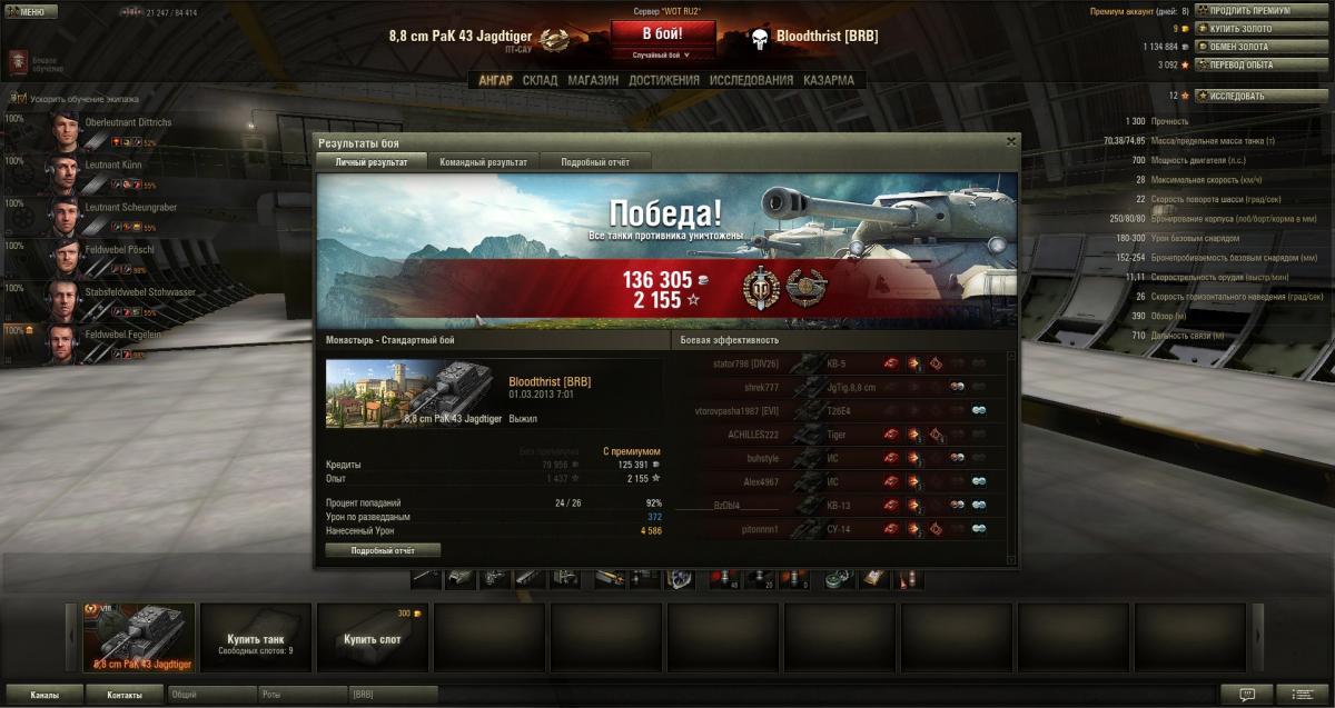я купил таки себе ягу88. Победа! Бой: Эрленберг 6 февраля 2013 г. 8:46:22 Танк: 8.8 cm PaK 43 Jagdtiger Получено опыта: 1 852 Получено кредитов: 120 093 за бой 3 крита движка и два пожара. ппц.