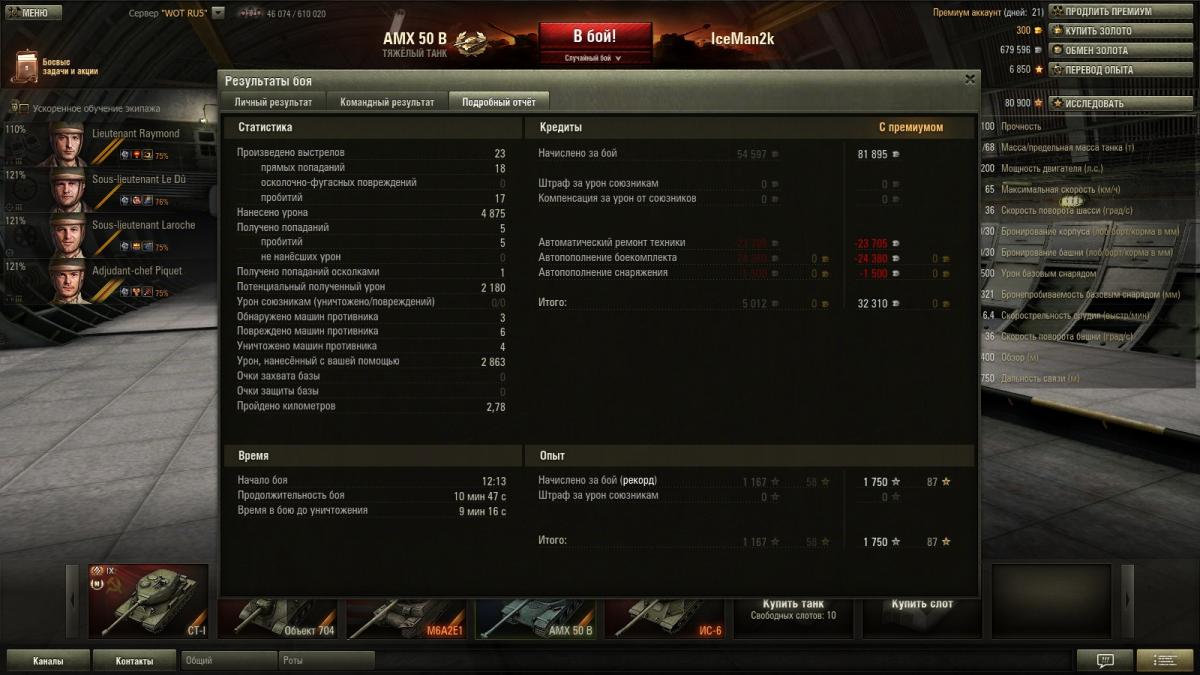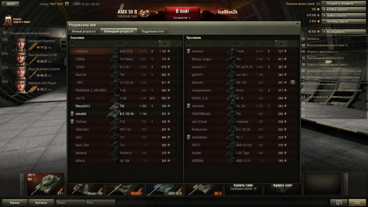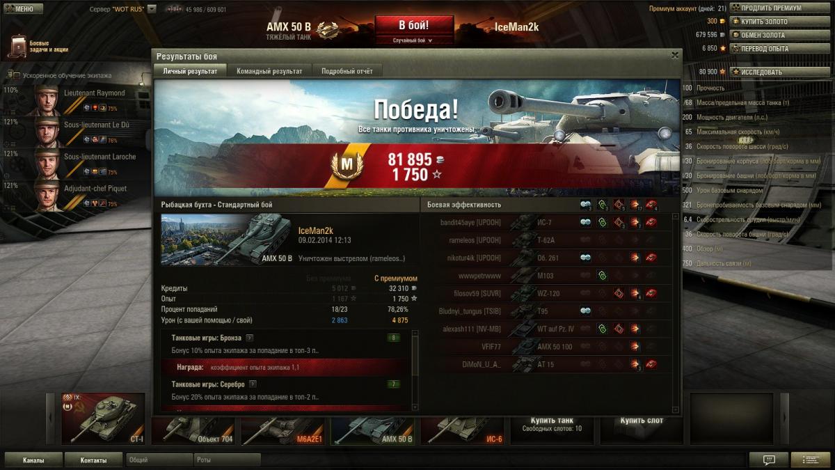 Откатал чуть более 80 боев на АМХ50В. Могу сказать, что игра на танке доставляет удовольствие. Лично мне играть на нем комфортно (в отличии от АМХ 50 100 и 50 120. АМХ 50 100 вообще не пошел у меня никак, КД 50 секунд просто убивало все желание играть). И вот сегодня где-то на 80-м бое, взял мастера. Вообще весь бой для меня прошел как обычный среднестатистический, но в итогах боя увидел что получил мастера. Приятная неожиданность. PS: Выкладываю реплей. Но строго не судите, я играю на АМХ50В достаточно средне, но стабильно. В конце затупил от неожиданности, что Т-62А заехал со спины, да и забыл что поворотный механизм сломан был, потому не успев довернуть стрельнул хз куда. И благополучно Т-62А меня слил. http://cdn-frm-eu.wargaming.net/wot/ru/uploads/monthly_02_2014/post-8011639-0-50171800-1391940900_thumb.jpg http://cdn-frm-eu.wargaming.net/wot/ru/uploads/monthly_02_2014/post-8011639-0-44907100-1391940901_thumb.jpg http://cdn-frm-eu.wargaming.net/wot/ru/uploads/monthly_02_2014/post-8011639-0-20889000-1391940902_thumb.jpg http://wotreplays.ru/site/1953026#rybackaya_buhta-iceman2k-amx_50b