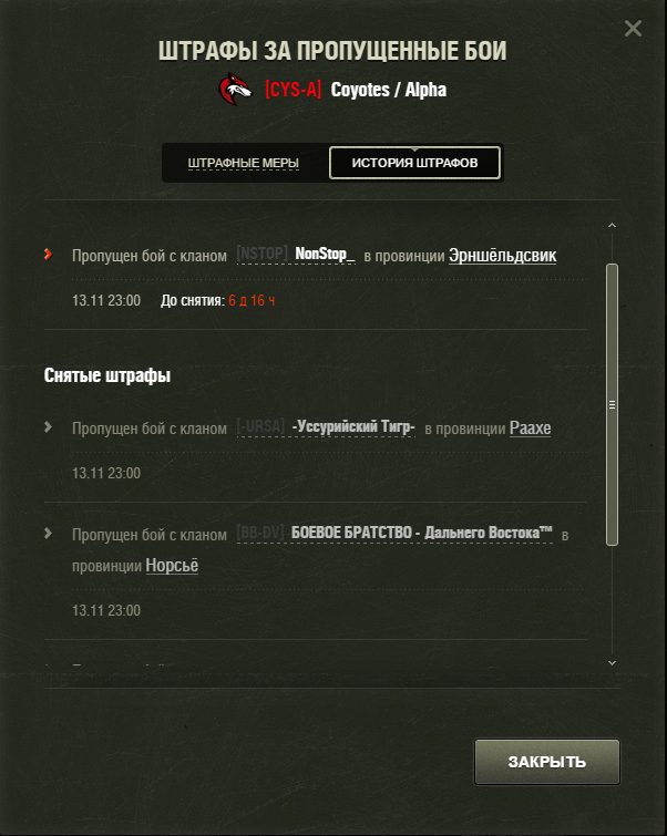 Уважаемые разработчики !!На новой гк существует система штрафов которая действует одинаково для всех!Почему клан пропустивший и невышедший на бой неполучил 4 штрафа , хотя по правилам он обязательно должен был их получить!Или у них есть привелегии???А у нас простых смертных сразу штрафы и никто их неснимает!