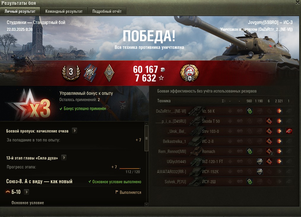 Вы не поверите, но я сделал 8-ую на ИС-3 (: Очень долго не получалось. При том выбил у 4 танков по члену экипажа и у одного что-то внутри. ИС-3