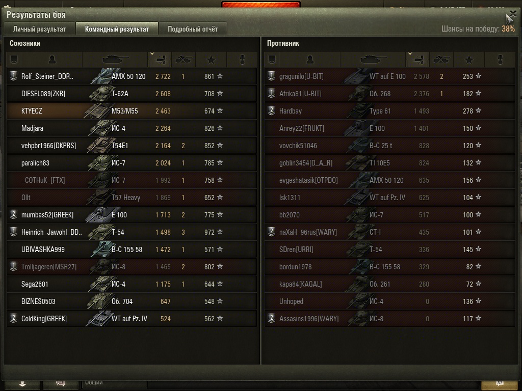 Итак, 6 августа 2013г., бой: http://s2.ipicture.ru/uploads/20130806/T8k0z6FR.jpg заподозрив неладное, поехал подальше от "линии слива". 1 выстрел, 1 попадание, убит почти в конце боя. Результат - 6:14 , причем, в начале боя противник вел 0:6. Секрет прост, в центре поля стояла ведьма с 4200 боями на этом танке (наверное 5 перков), которая получила разведчика и дозорного, даже не засветившись....Бой был проигран, не начавшись. Вот его итоги: http://s2.ipicture.ru/uploads/20130806/IIsirt4n.jpg Решил проанализировать этот бой и выяснилось следующее - количество общих боев у нас - 47500(суммарно у всех игроков), у противника - 66800!, количество боёв на той технике, что воевала в бою - у нас - 2144, у них - 8900!!! % побед у нас - от 44 до 52(общий суммарно-718, средний - 47,86), у них - от 47 до 60! (общий суммарно - 743, средний - 49,53!). По три клановца в команде, но у нас 2 новобранца и дипломат, у них 2 солдата и полевой командир, сделавший игру. Интересна ли такая игра? Конечно же нет, и проигрыш неприятен, тем более, что практически никто из наших не мог повлиять на исход игры, что не справедливо!!! Вопрос - как к этому относятся игроки и разработчики? Мне кажется, что вместо работы над ухудшением арты, может стоило бы поработать с ВБР??? P.S. На 2й картинке внизу - моя техника. СУ-5 и 26 это памятники интересной игре, которой, увы, наверное не будет.Или......