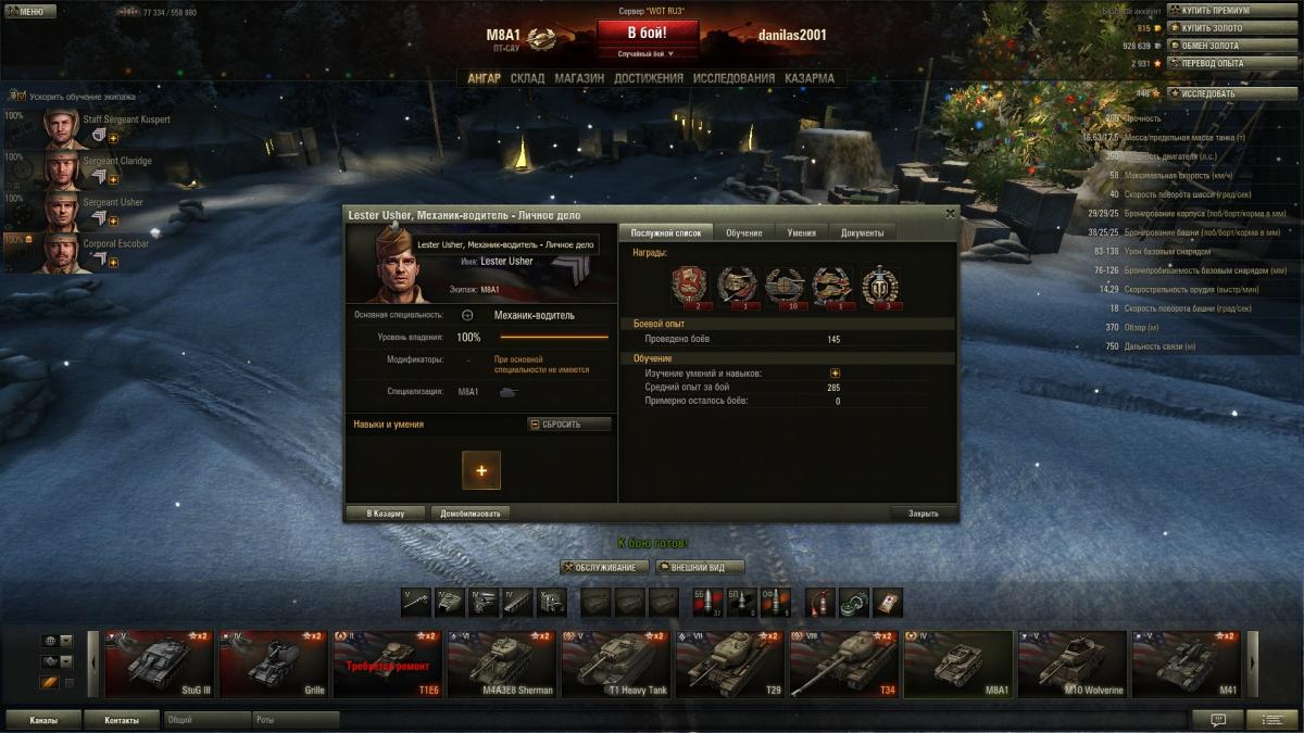 На Т49 пересесть и продать М8А1 для меня-выход из игры навечно. Победа!Бой:Рыбацкая бухта 26 февраля 2013г. 19:53:18 Танк:М8А1 Врагов уничтожено:11 Получено опыта:2430 Получено кредитов:29257 Дамага нанесено:2713 Достижения в бою:"Воин","Снайпер",Медаль Фадина,Медаль Колобанова,Медаль Бийота.
