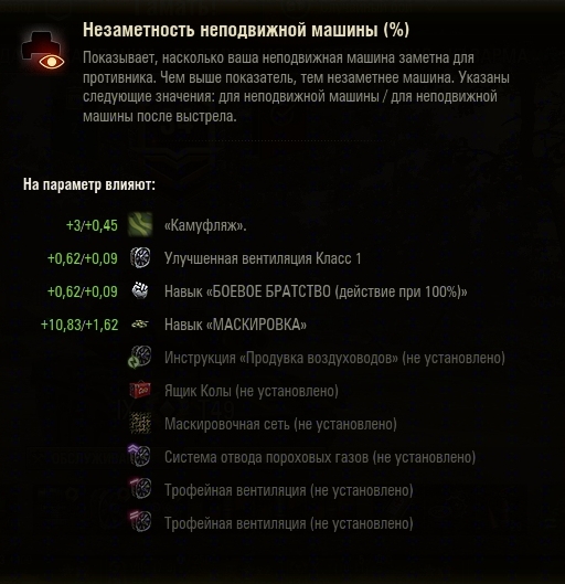 всем привет! не могу разобраться, куда уходят обещанные 10% незаметности за установленную предбоевую инструкцию "Укрытия на местности" почему этого параметра нет в данном списке (скрин) умение "маскировка" прокачана у всех членов экипажа