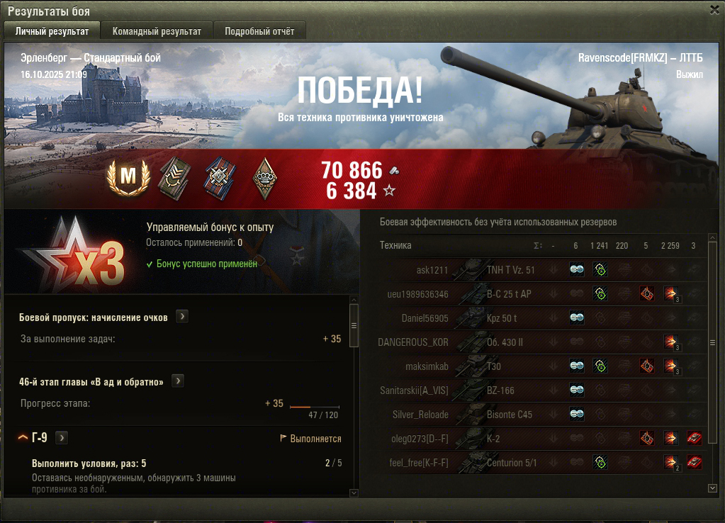 Тем не менее, путь пройден, вазик куплен. В топ выводился более-менее комфортно, по сравнению с предыдущей тачкой. Сборки по оборудованию пробовал разные, пока остановился на: СПМ Т3+фиолет.вент+фиолет досыл. Экипаж подкармливаю доппаем. В топовой комплектации сыграно примерно 50 боёв. Поделюсь предварительными итогами. Мобильность