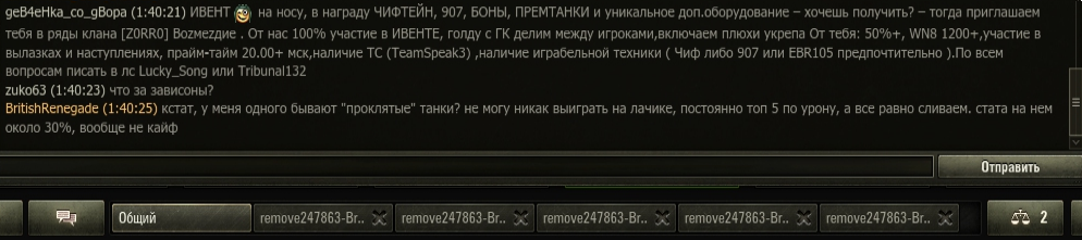 (Поздний) вечер добрый. Сидел сегодня в чате, периодически добавляя в него сообщения. Вдруг - приходит сообщение от неизвестного аккаунта со странным именем (в бою не встречал, знать - не знал, в чате - не видал). http://cdn-frm-eu.wargaming.net/wot/ru/uploads/monthly_02_2020/post-82003231-0-71331300-1580770410_thumb.png Сообщение абсолютно пустое, как и сам профиль. Добавление его в черный список проблему не решает, так как сообщения всё-равно приходят, причём с интервалом около 25 секунд. Хотя ник одинаковый, сообщения приходят в отдельные окна, таких же пустых. Что за прикол и с чем его едят? http://cdn-frm-eu.wargaming.net/wot/ru/uploads/monthly_02_2020/post-82003231-0-02553300-1580770412_thumb.png