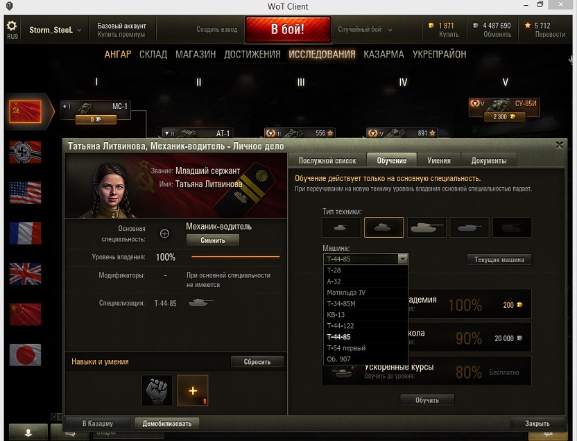 Добрый день! Появился вопрос по девушкам-танкистам. После получения девушки предлагается выбрать нацию, а затем танк, на который она будет обучена. Вопрос: в списке доступных танков для девушки-танкистки у меня значатся только премиумные и какие-то несуществующие танки, которых нет в дереве исследования техники. Например, за СССР для "средних танков" мне предлагаются на выбор только "Т-34-85М", "Т-44-122", "Т-44-85", "Т-54 первый", "Об.907", которых вообще нет в дереве исследования. И так для всех типов танков и для всех наций (с США то же самое, например) Почему нельзя посадить девушку на стандартный танк?