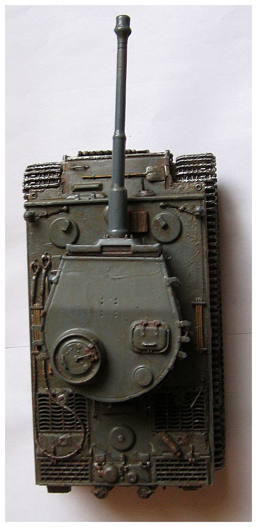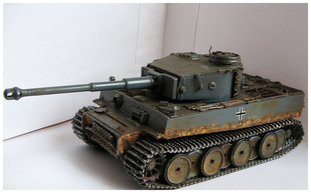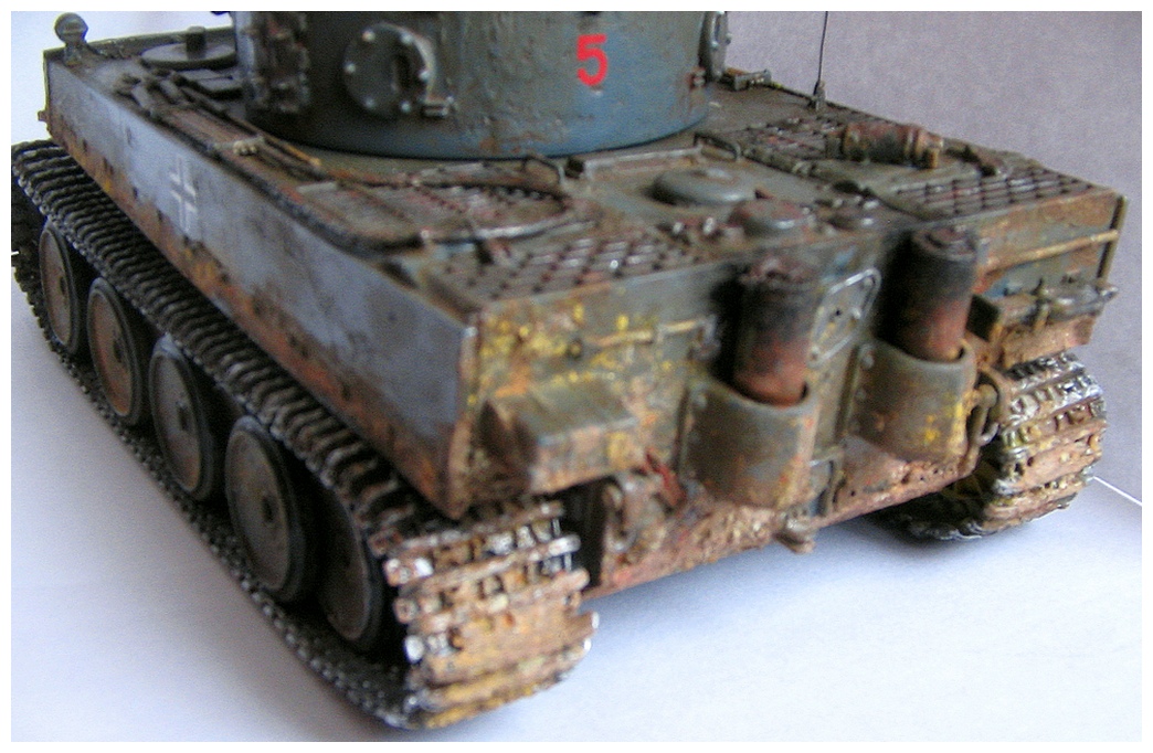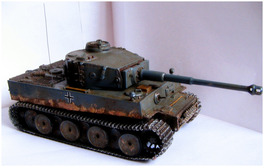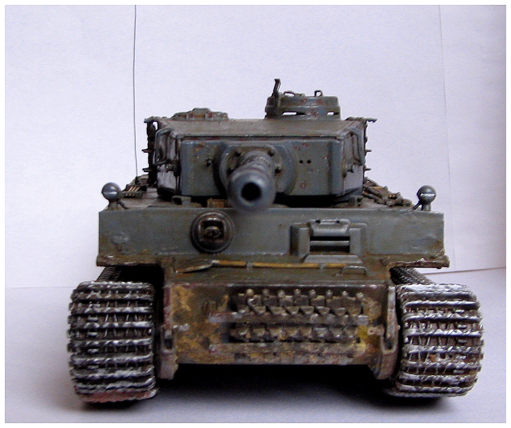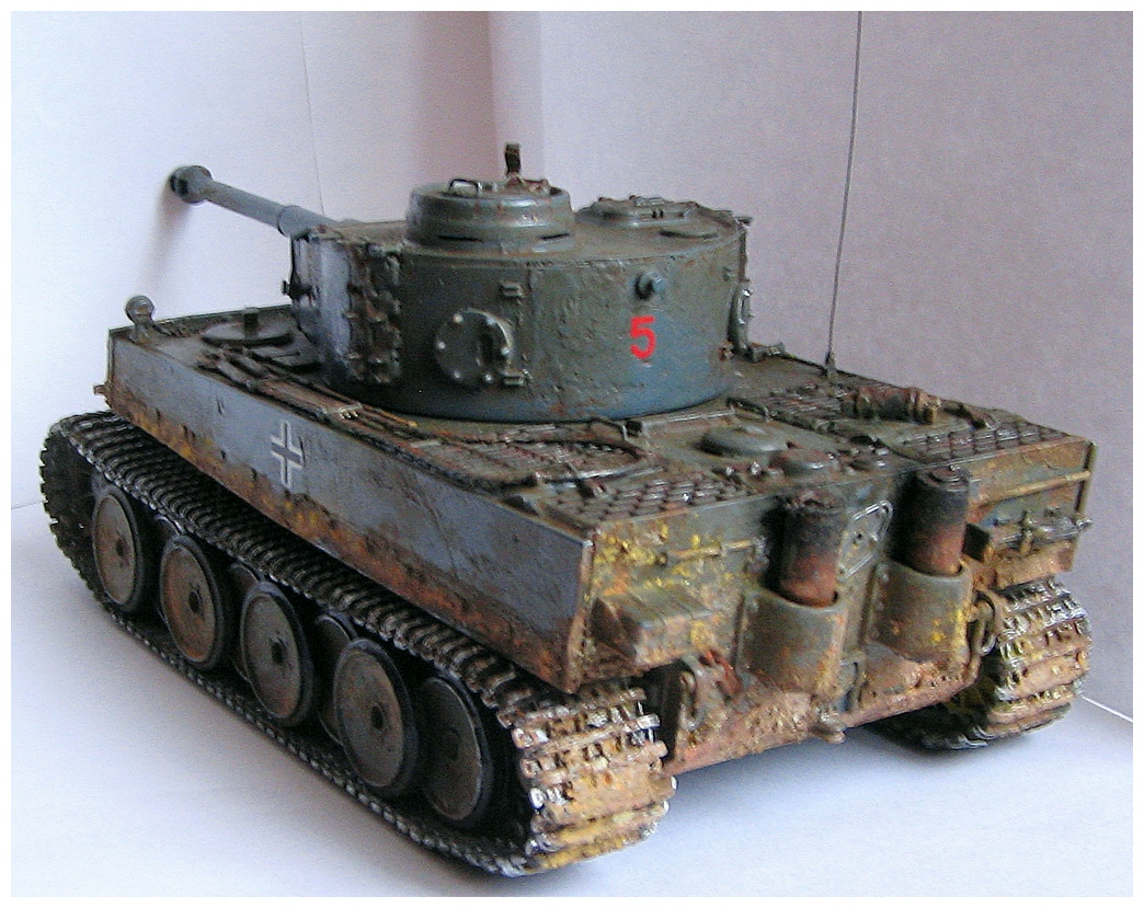 Всем доброго времени суток. Предлагаю вашему вниманию модель "Тигра" в масштабе 1:35 от "Звезды" (из пластика, естественно). Красил сего зверя нитроэмалью из баллона, мелочи - акрил "Звезды", смывал маслом+ уайтспирит, пигментация - пастель на водке. Загрязнинг - пастель, шпаклевка. Тигр за нумером "5" круто покоцанный в боях, попачканный в русской грязюке, а потому очень ободранный и симпотяжный. За что прошу любить его и жаловать. Спасибо за внимание к моей работе. Всем удачи в боях!!!