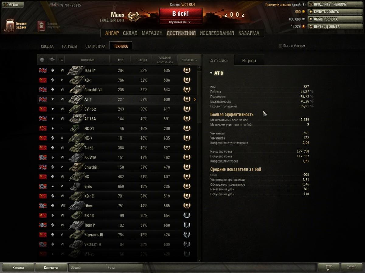 Извините папка.Однако с арифметикой у вас не лады.Вам простая задачка.В ангаре 50 ед. техники с 1 по 10 лвл.ЛТ-10,СТ-12,ТТ-16,ПТ-8,САУ-4. 1-6 лвл -32ед,7-10лвл-18 ед. Вопрос: 1.Какой будет средний дамаг на всей технике в ангаре? 2.Какой будет средний пробой с учетом всей техники в ангаре? 3.Может ли быть при наличии данной техники средний уровень танка выше 7? А насчет обузы для вас папка и в качестве подсказки приведу вам скрин. Заодно и часть техники увидите и распределение статы на танках. Да и заодно посмотрите второй скрин под следующей цитатой. http://cdn-frm-eu.wargaming.net/wot/ru/uploads/monthly_09_2013/post-8279565-0-33723100-1379543272_thumb.jpg Очень милая медалька.А вот адреналин-да!Маленький пример. http://cdn-frm-eu.wargaming.net/wot/ru/uploads/monthly_09_2013/post-8279565-0-91345200-1379543296_thumb.jpg Абсолютно с вами согласен,такая же фигня.С чем это связано так и не понял.Стараюсь на выявленой сливной технике в этот день играть.