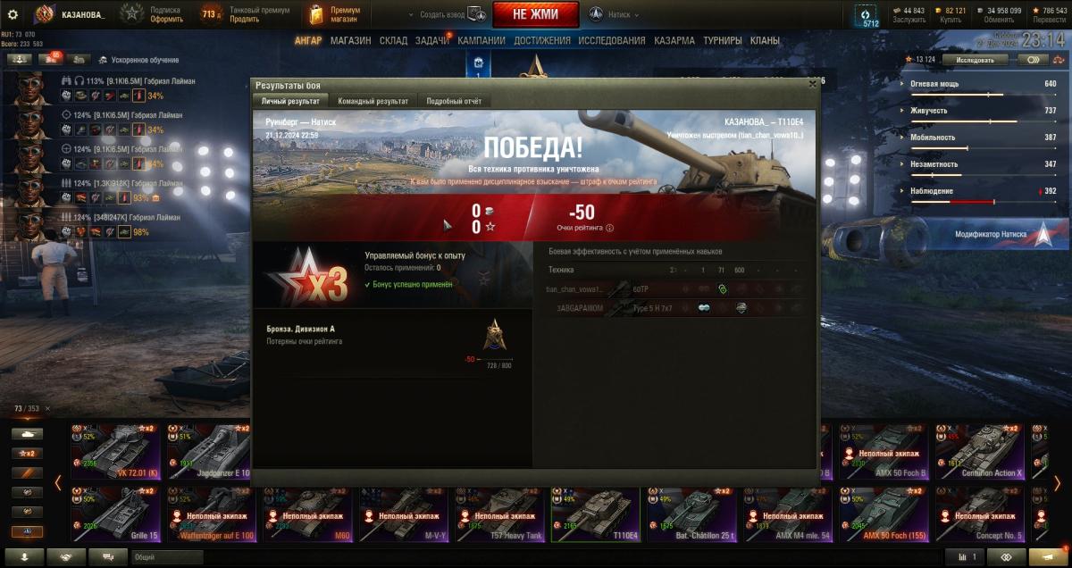 Уважаемые разработчики. Опишу свою логику и смысл для меня игры в натиск после вашим изменений. Барахло, типа камуфляжей и нашивок не интересует. Интерес был в покупке танка. В предыдущем дошёл до золота, купил танк. Я себя оцениваю адекватно, мой потолок это золото. В этом сезоне для покупки танка надо попасть в чемпионы. Для 99% это не реально. Давайте смотреть правде в глаза. Исключения лишь подтверждают правило. Поэтому в такой формат натиска играть не буду. Попробовал, понял, что продвинуться до чемпиона не реально. Поэтому хорош. Если не будет возможности купить танк за попадание в золото, играть не буду. Или переработайте систему начисления очков за поражения. Типа 1 место, чуток в плюсе, 2 - не снимаются. Хотя-бы так. Тогда возможно доползти до чемпионов.