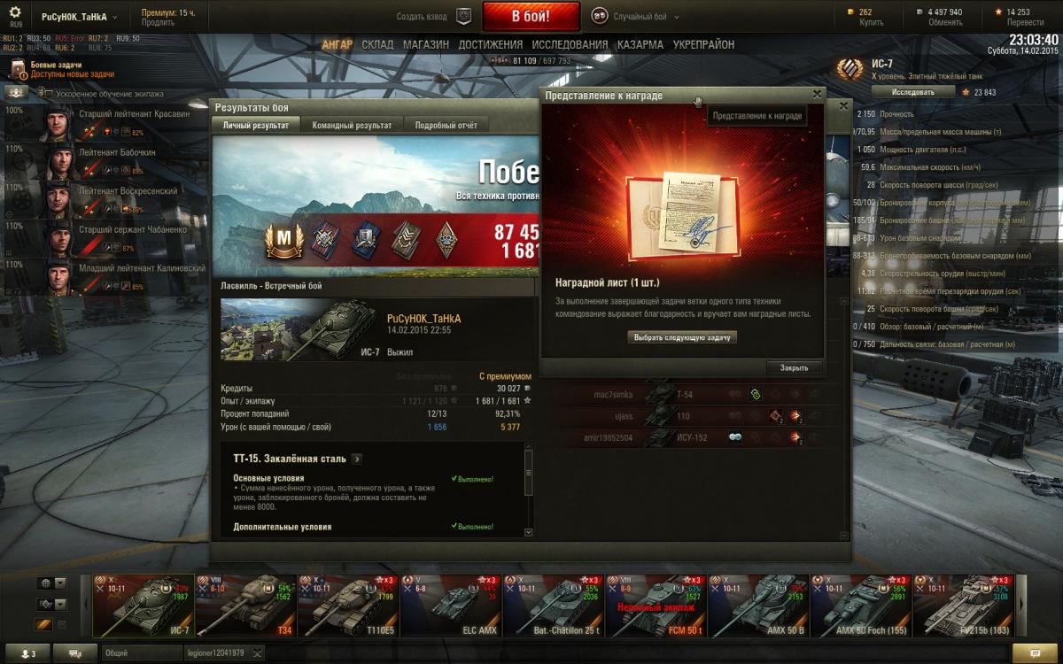 http://cdn-frm-eu.wargaming.net/wot/ru/uploads/monthly_02_2015/post-832284-0-72808800-1423943049_thumb.jpg Выполнил уже третий раз ТТ-15 с поражением....пока 4 тяжа пытались меня пробить...остальная команда слилась в другом конце карты 11 противникам.http://cdn-frm-eu.wargaming.net/4.3/style_emoticons/wot/Smile-angry.gif http://cdn-frm-eu.wargaming.net/wot/ru/uploads/monthly_02_2015/post-832284-0-95005700-1423944552_thumb.jpghttp://cdn-frm-eu.wargaming.net/wot/ru/uploads/monthly_02_2015/post-832284-0-57294700-1423944570_thumb.jpg Ура! два дня мучился...но наконец-то танканул в сумме даже на 12 и победил!Так и знал,что в выходные нужно ждать вечера пока самых упоротых детишек отгонят от компа родители. Всем того же и желаю! и чтоб балансер не кидал в пустыню когда вам надо в городе снаряды половить.)) Насливался черти сколько раз....и именно в этом бою решил,что не буду играть чисто под лбз...а буду на дамажку и сохранение своего хп,а не на оборот.И сразу повезло...