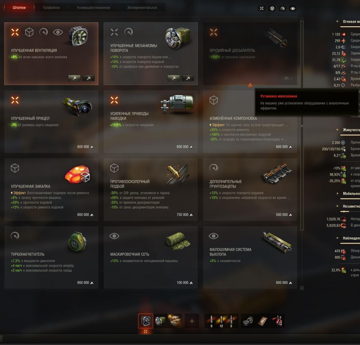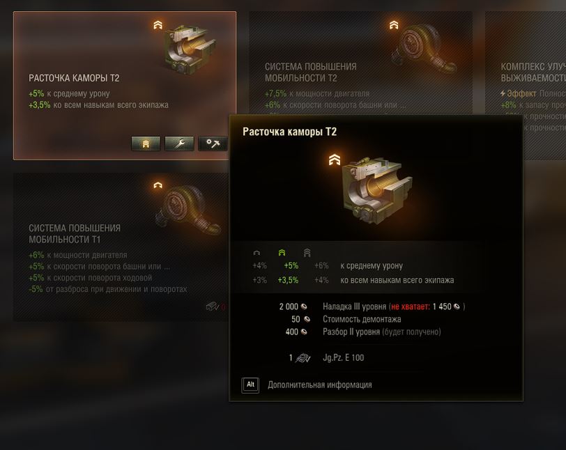 4. Расточка камора к среднему урону (то есть + не 25%, раз в 5 лет, а 30% по моим модулям считаю) и всем навыкам, её нельзя поставить вместе с досылателем который дает минус к кд, игра говорит что уже установлен модуль с подобными характеристиками, но подобные характеристики это вентилятор +6% и того с расточкой 9,5% в моем случае к навыкам Может надо вентиль, а не досылатель блокировать Думаю как было)) чел с баланса посчитал что, средний урон в минуту который дает досылатель, это одно и тоже что и подросший, но нет, средний урон за выстрел и давайте по делу, просто интересно