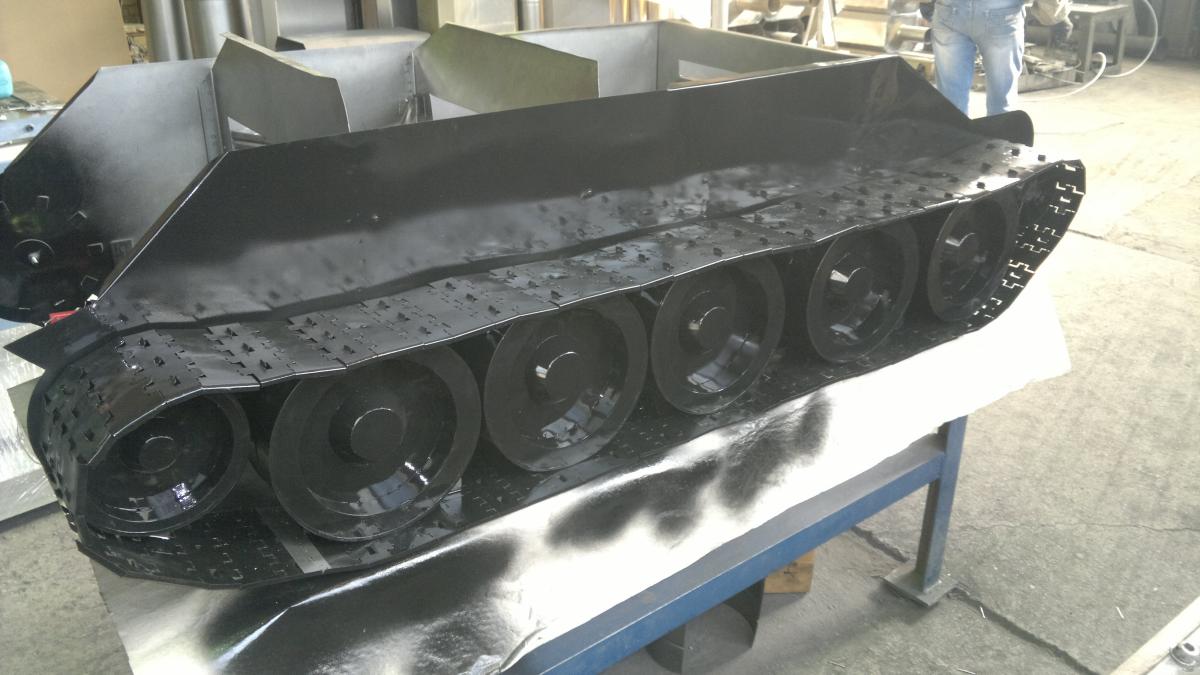 Сразу видно, в моделировании не мимо проходил)) Да, гусли это сплошная металлическая лента с имитацией траков. По другому не получается, ошибка была с самого начала, полмиллиметра слишком тонкий металл и не получится сделать из такой фольги систему натяжения для удержания гусли или вращающиеся катки, учту на будущее, что там полтора миллиметра надо, да и времени на изготовления отдельных траков не осталось, на следующей неделе поход на Москву, вот и решил схитрить. Но смотрятся они все равно хорошо. Ах да, выставка в Москве пройдет, когда узнаю точное время и дату, напишу, можно будут придти и в живую на него посмотреть, пощупать) Вес килограммов сорок пять - пятьдесят, на руках из цеха выгонять будем.