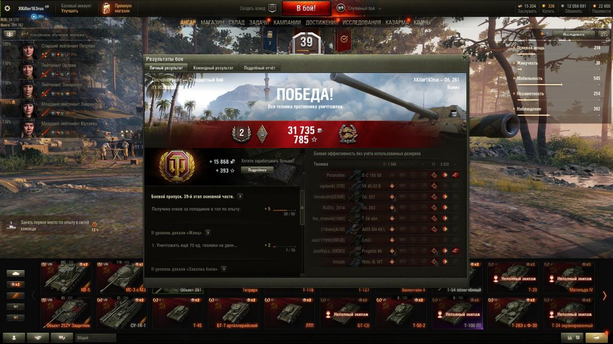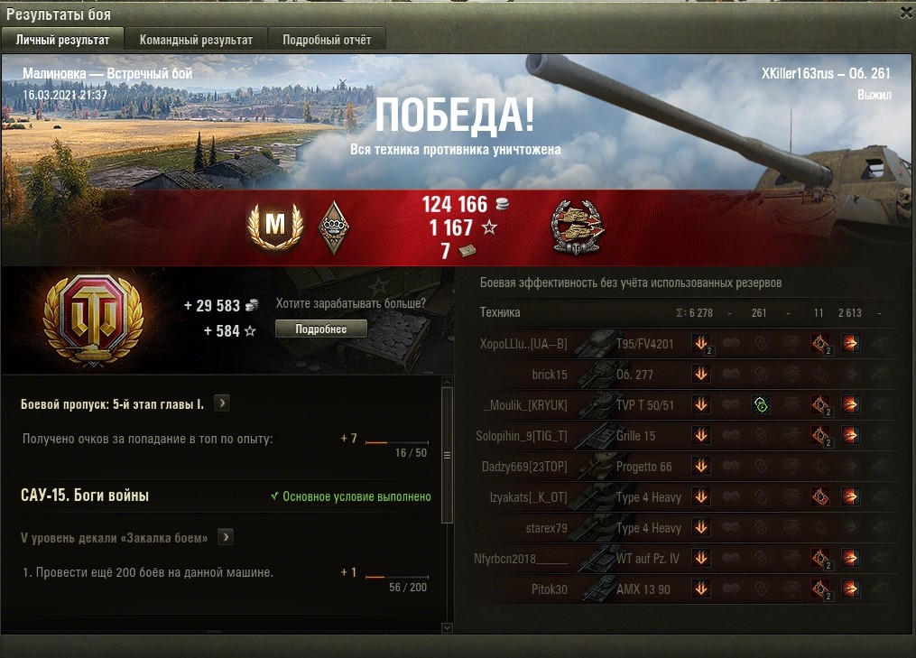Здравствуйте, любимое сообщество! Смог выполнить САУ-15 на об.260. Вкратце: взял об.261, оборудование трофейное - досыл, наводка. Карта - малиновка. Свыше 1 100 опыта, 0 фрагов. Запись и скрины прикрепляю. П.с. много слышал, что на 10-ках тяжело выполнить, особенно на об261. Лично мне на нем лучше всех. Вкачал и пробовал M40/43 - вообще не моё! П.п.с. Опирайтесь на собственную статистику и не сворачивайте с пути, ведь рано или поздно вам точно будет дуть попутный ветер! replay_last_battle.wotreplay