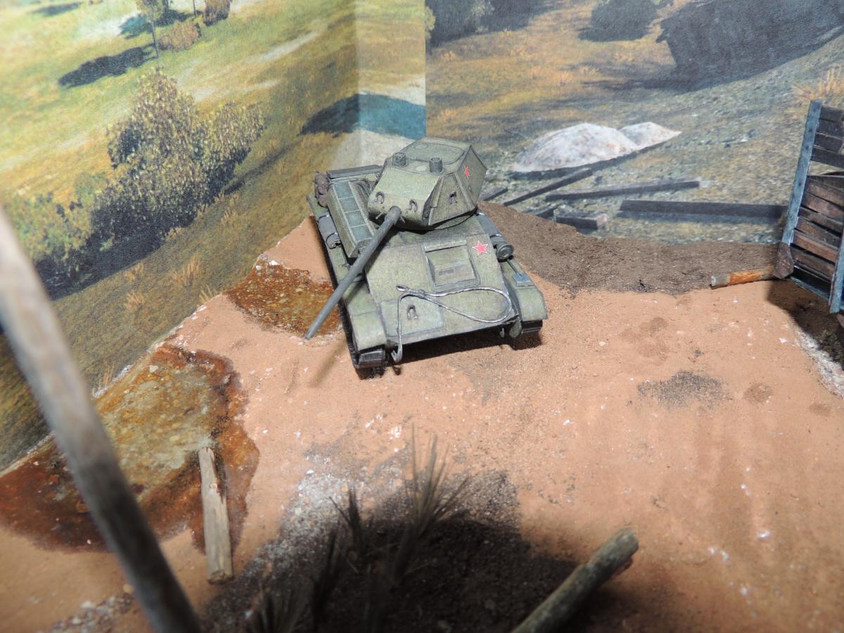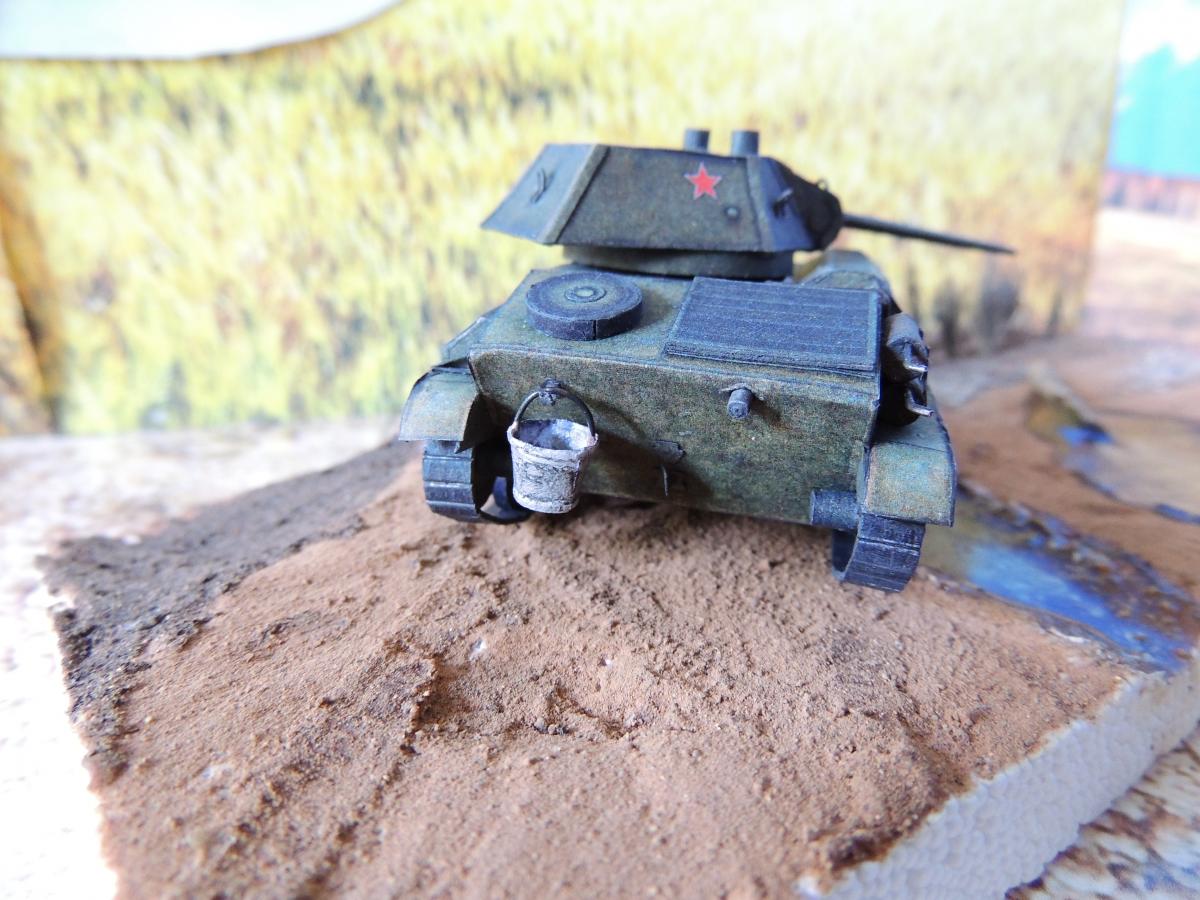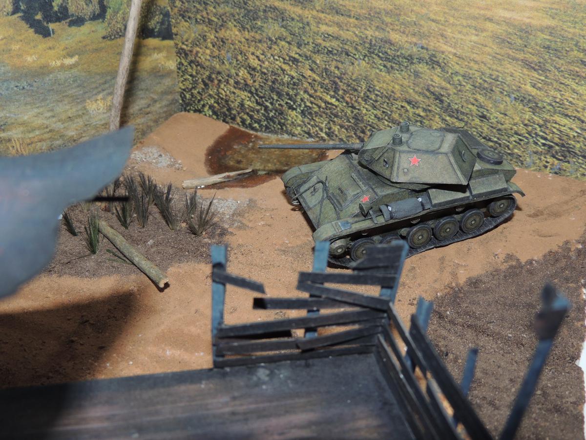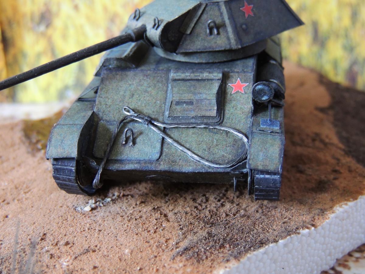 Изменения: На надгусеничных полках лежат маскировочные сети, спереди закреплён буксировочный трос, сзади ведро. Подробнее рассмотреть Т-70 и узнать из чего и как сделана диорама можно в разделе Бумажные диорамы Wargaming.