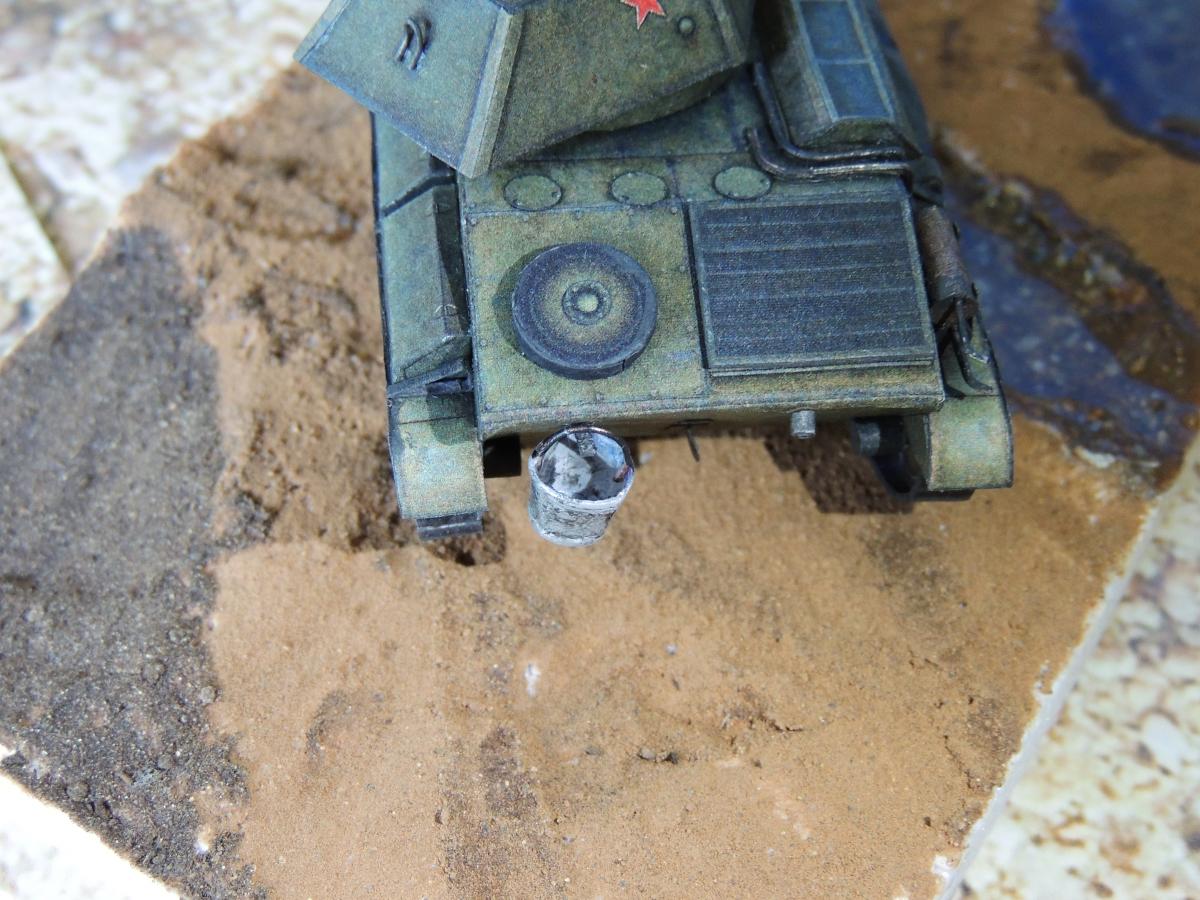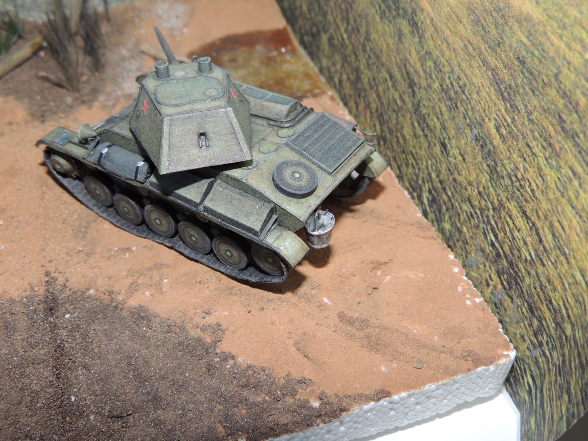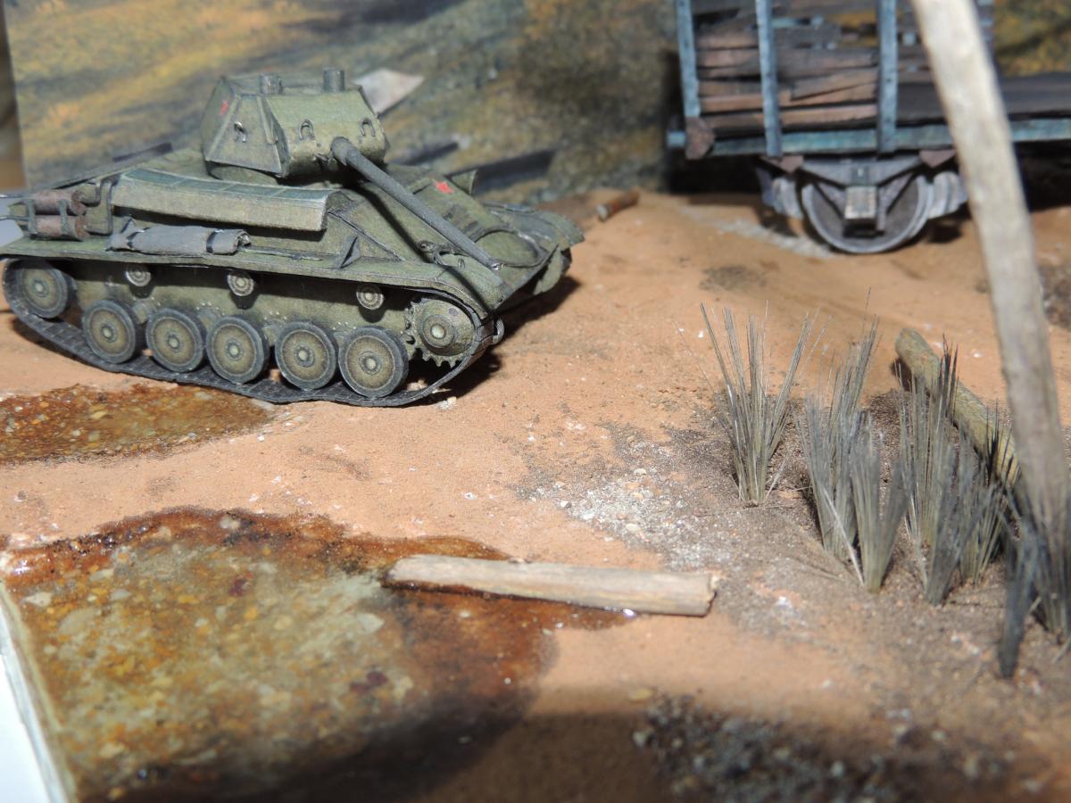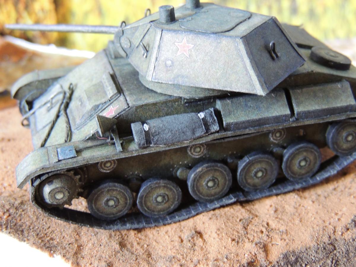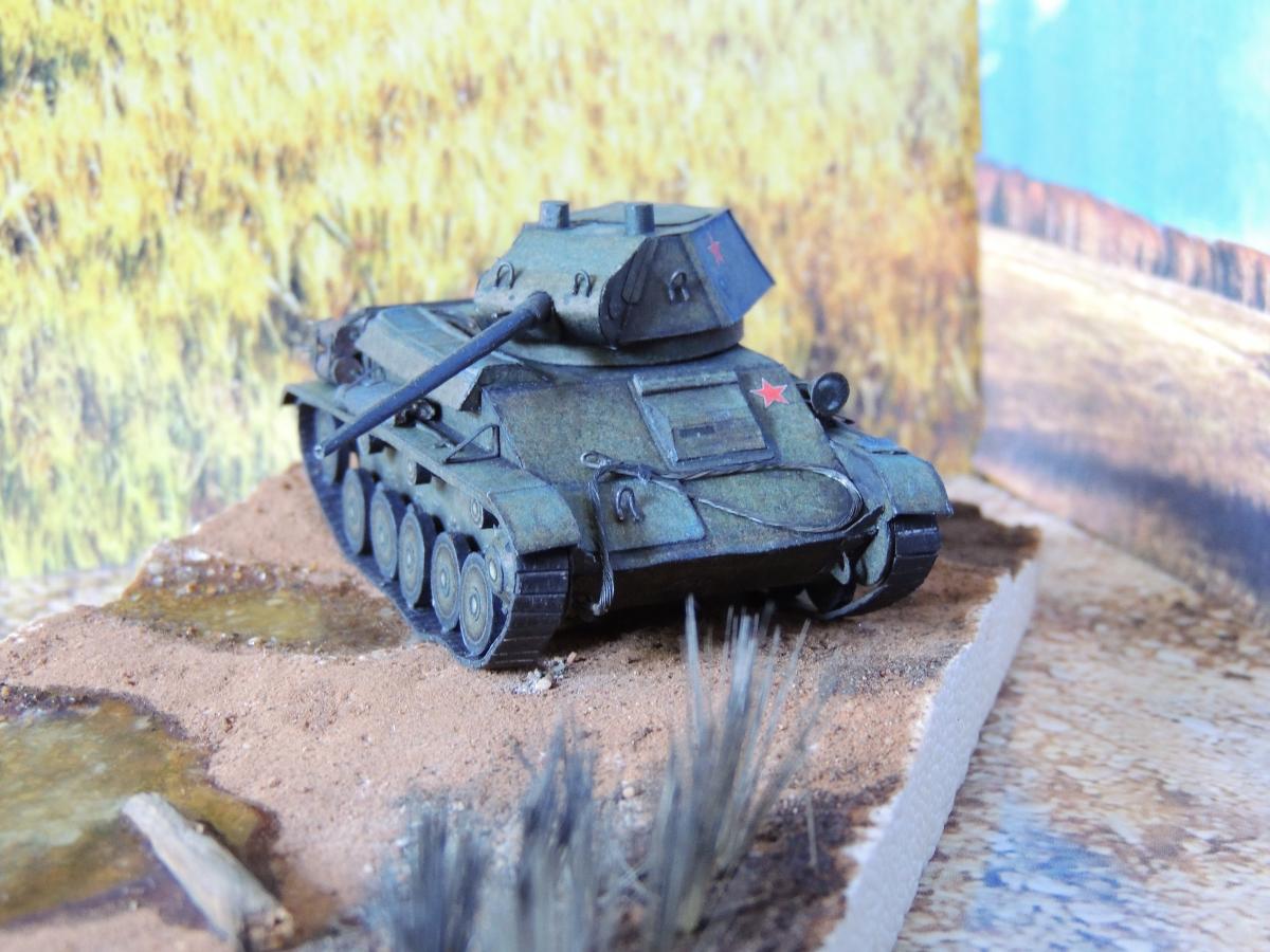 Изменения: На надгусеничных полках лежат маскировочные сети, спереди закреплён буксировочный трос, сзади ведро. Подробнее рассмотреть Т-70 и узнать из чего и как сделана диорама можно в разделе Бумажные диорамы Wargaming.