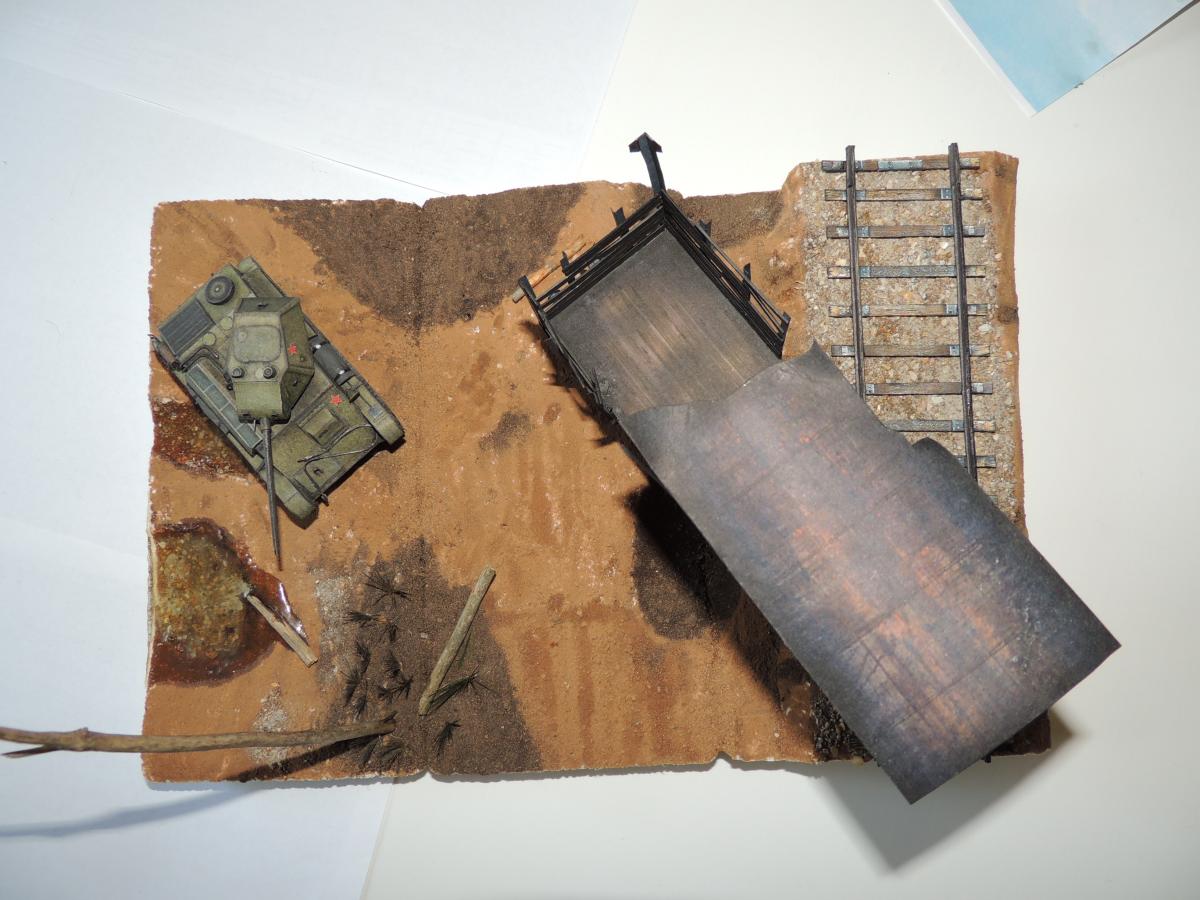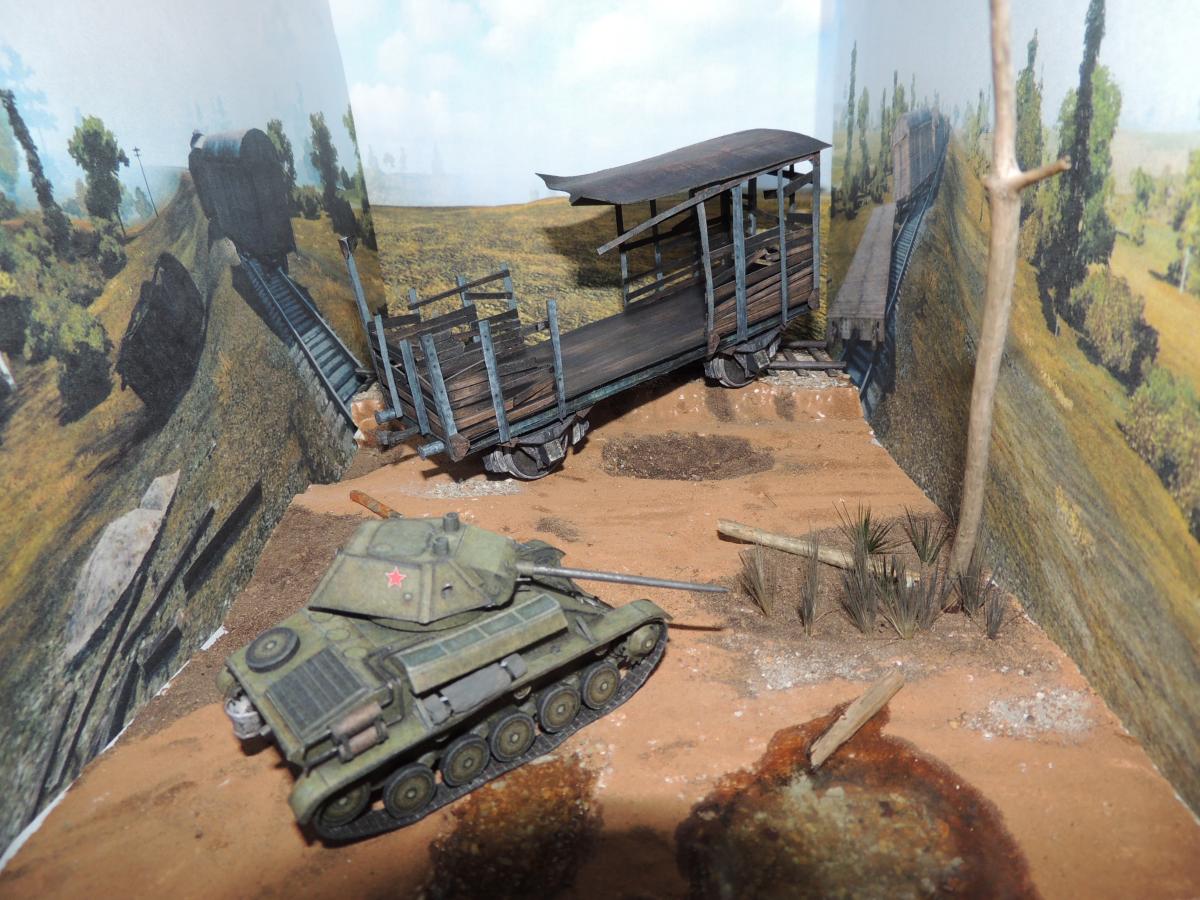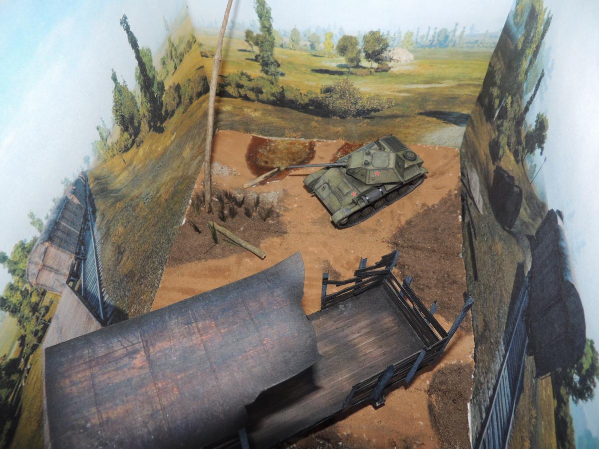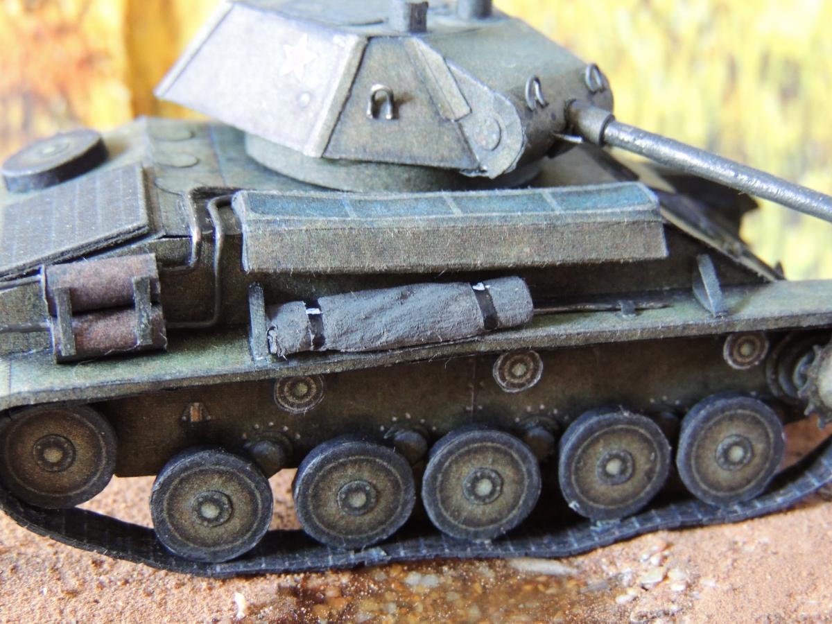Изменения: На надгусеничных полках лежат маскировочные сети, спереди закреплён буксировочный трос, сзади ведро. Подробнее рассмотреть Т-70 и узнать из чего и как сделана диорама можно в разделе Бумажные диорамы Wargaming.