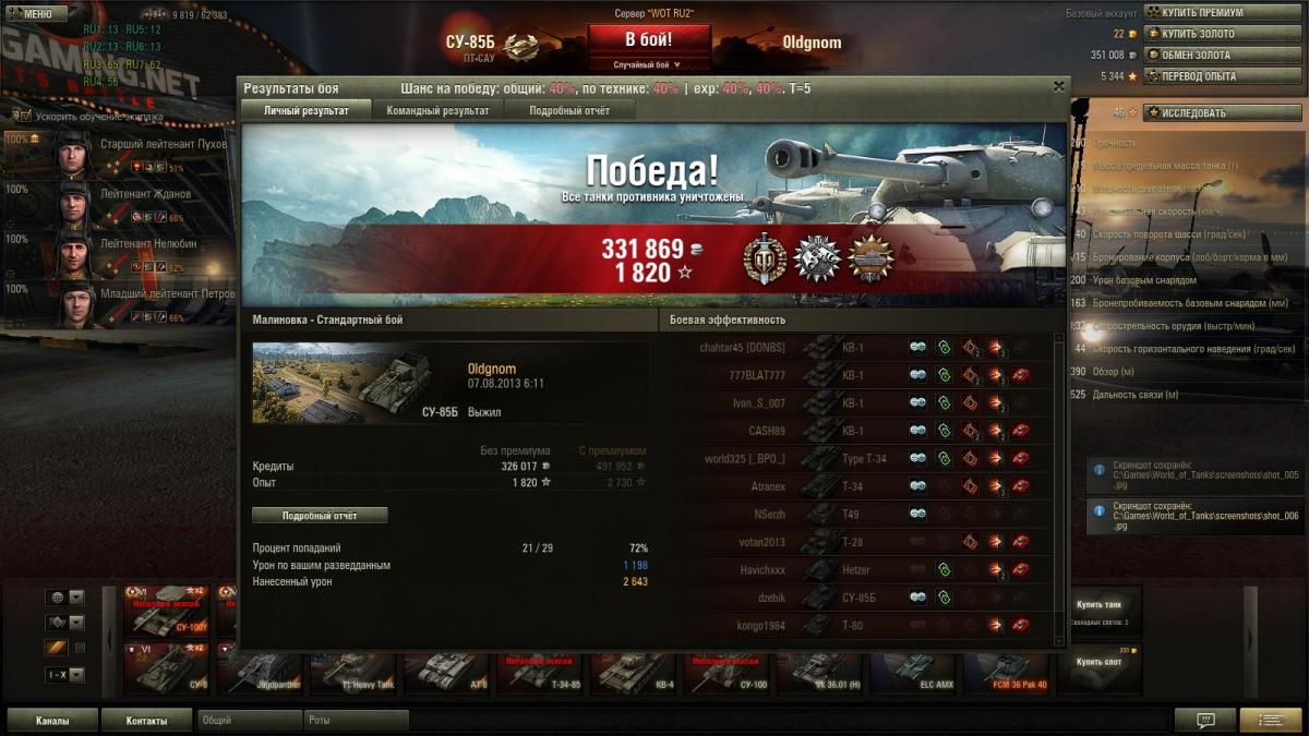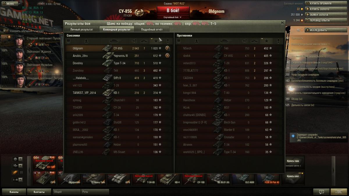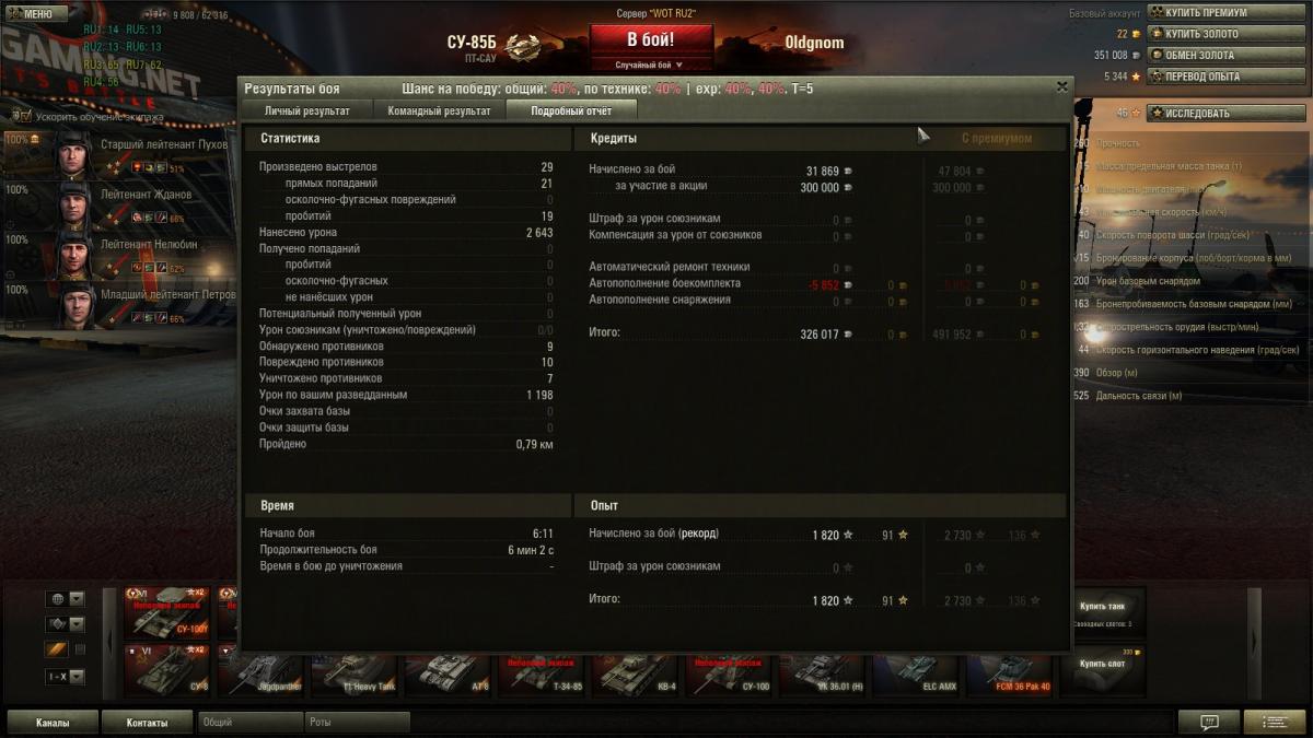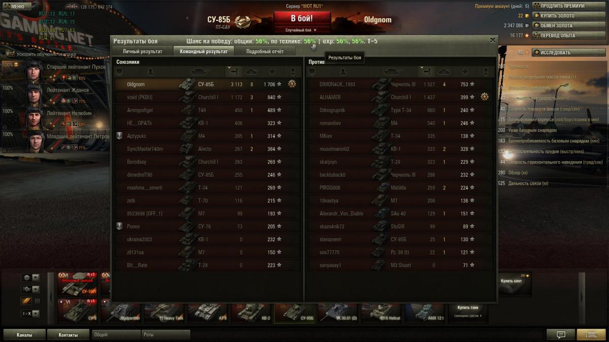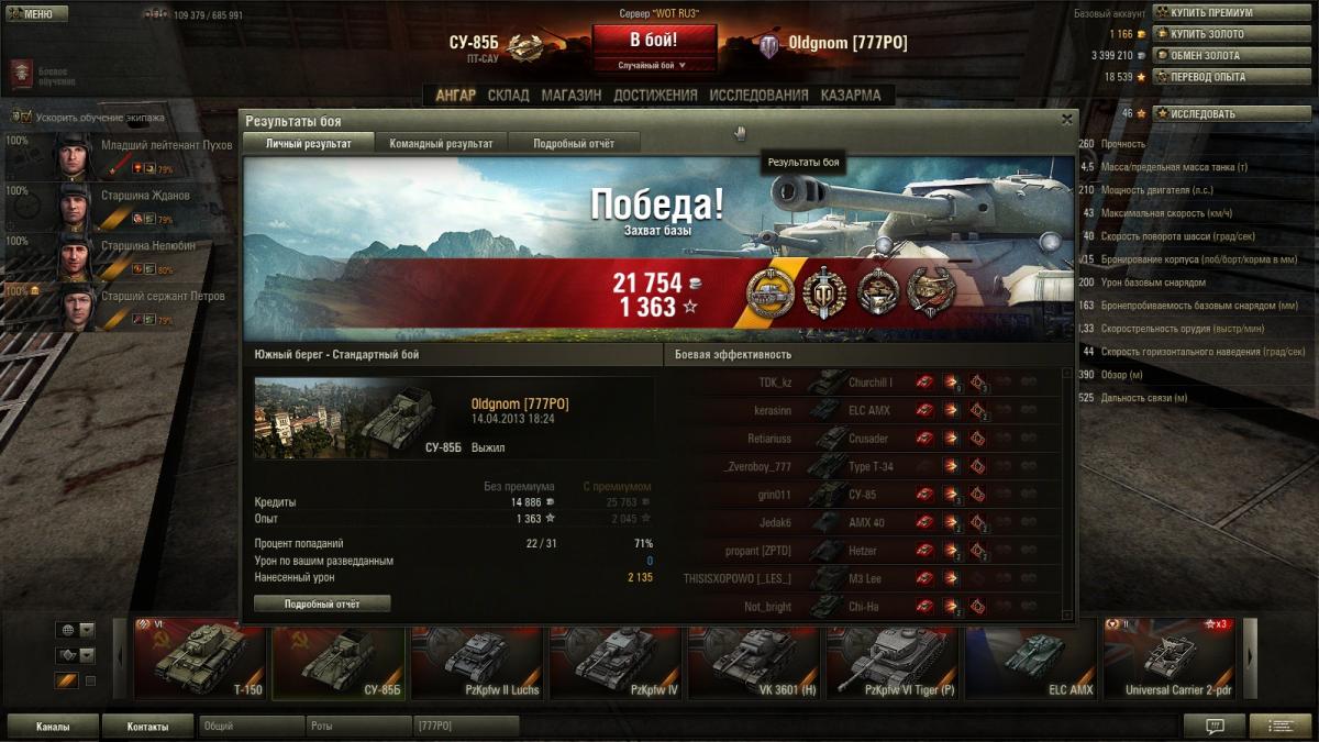Интересно какова планка топ50 будет на су85б? Решил попробовать урвать голды, вывел из ангара... 1820 чистого. Мне нра. :) http://wotreplays.ru/site/1143364#team ЗЫ: Как ваше мнение, у Psycho_Artur чит или удача: http://wotreplays.ru...-0ldgnom-su-85b 3 раза подряд попал по мне, при том что я не засвечивался.