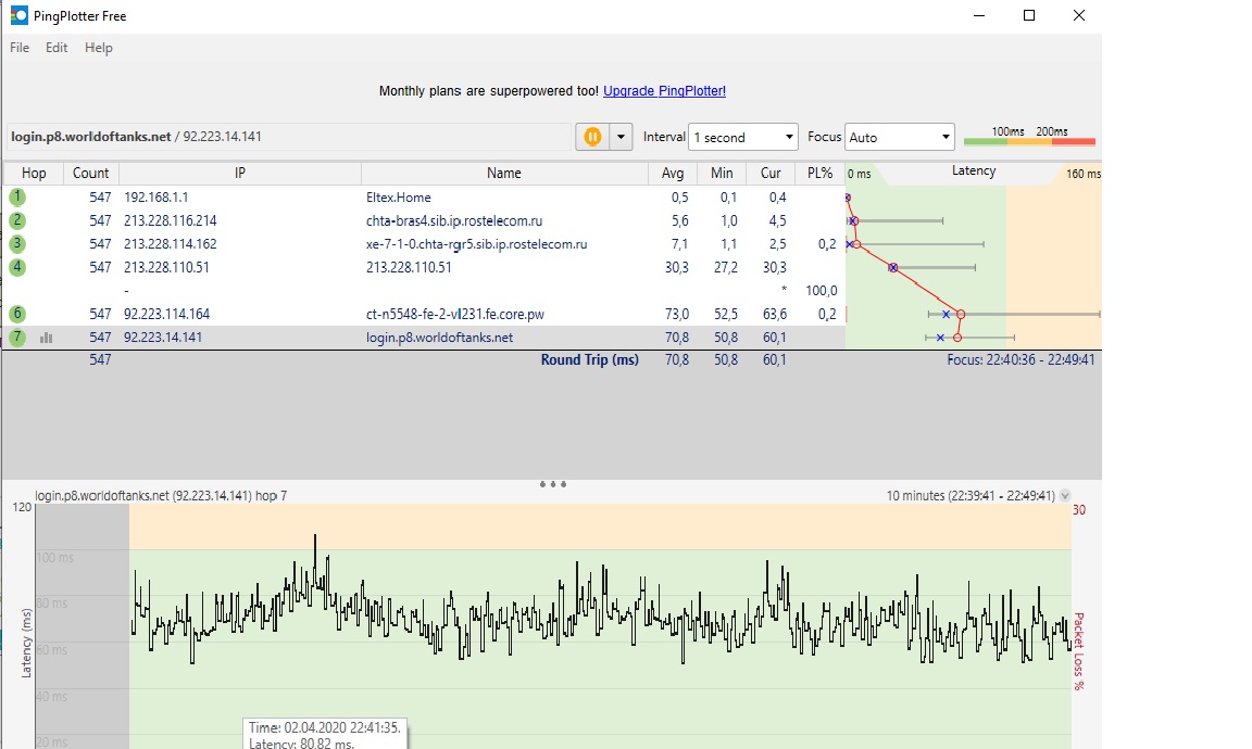 http://cdn-frm-eu.wargaming.net/4.5/style_images/wg/snapback.pngZloyBut (02 апр 2020 - 13:15) писал: Как видно на скрине задержки передачи выше 1500 мс уже на ПЕРВОМ узле. Это ВАШ компьютер или маршрутизатор. Опишите ваше оборудование - как что с чем какими проводами соединено. модем оптический элтекс, витая пара до компьютера, пинг плоттером тестил все косяки где писал выше. между прочим от него и телевизор и телефон работают все нормально. А графики на пингплоттере с точностью до наоборот не у меня косяки а у вас