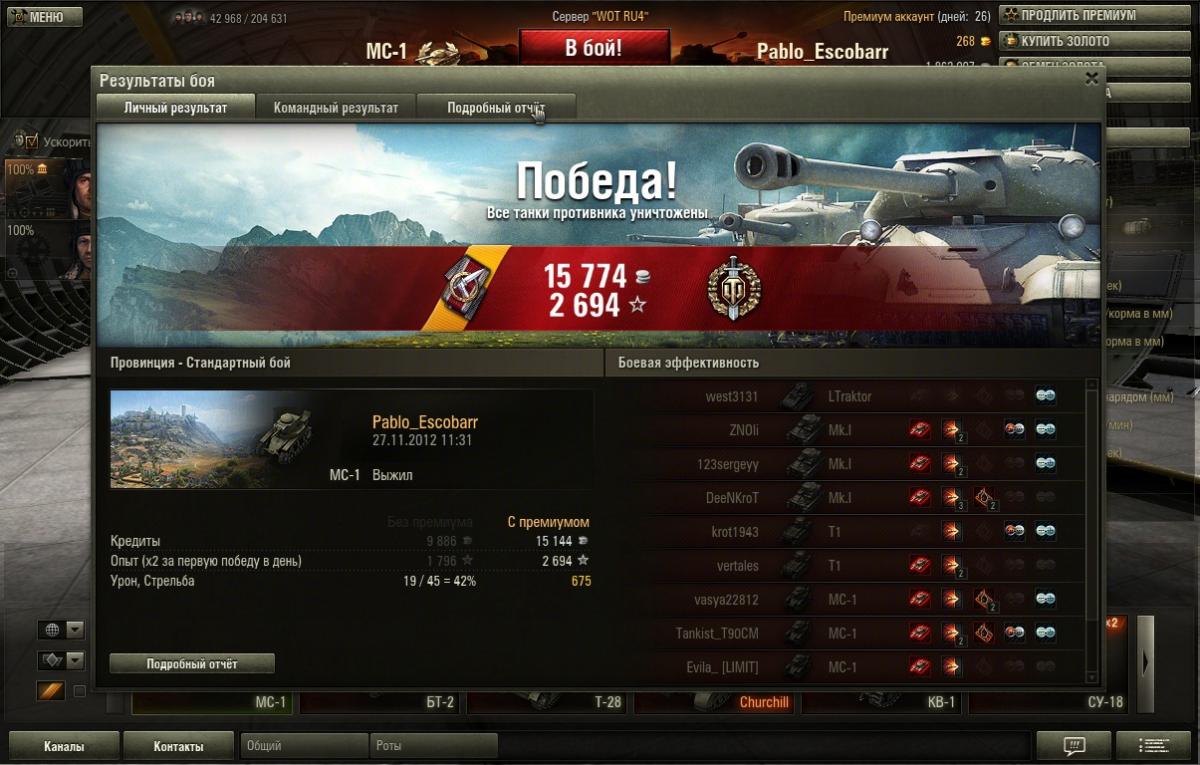 Сел размяться перед работой =) Победа! Бой: Провинция 27 ноября 2012 г. 11:31:12 Танк: МС-1 Получено опыта: 2 694 (x2 за первую победу в день) Получено кредитов: 15 774 Достижения в бою: «Воин», «Коса Смерти»