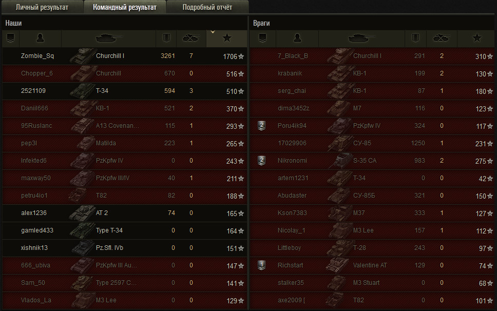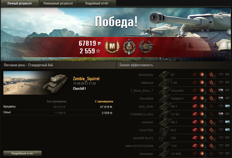 Ненапряжный бой. Стоял на одной позиции и стрелял по КД. Как итог: "снайпер", "воин", "мастер", 3000+ урона, 7 фрагов. Танк я бы не назвал лучшим ТТ 5 уровня, но иногда на нем выходят неплохие бои. http://cdn-frm-eu.wargaming.net/wot/ru/uploads/monthly_09_2013/post-8810732-0-40754600-1379170485_thumb.jpg http://cdn-frm-eu.wargaming.net/wot/ru/uploads/monthly_09_2013/post-8810732-0-11109200-1379170506_thumb.jpg http://cdn-frm-eu.wargaming.net/wot/ru/uploads/monthly_09_2013/post-8810732-0-31414700-1379170496_thumb.jpg http://wotreplays.ru...rel-churchill_i