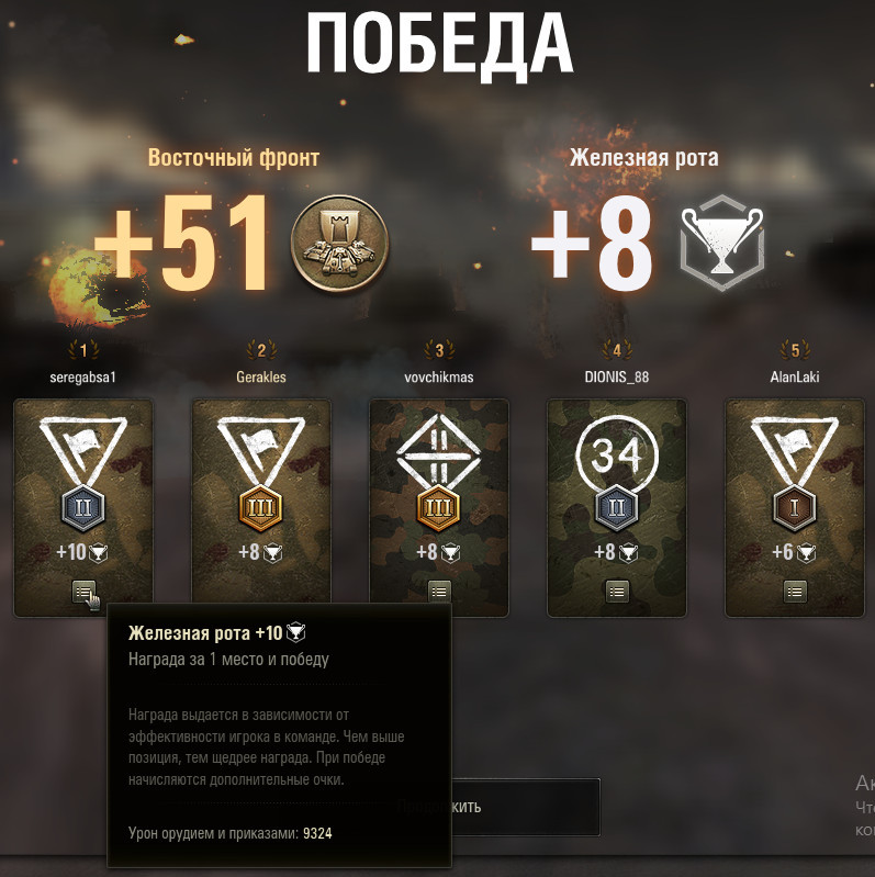 http://cdn-frm-eu.wargaming.net/4.5/style_images/wg/snapback.pngA_Bapbka (05 авг 2019 - 10:23) писал: 9324 урона явно больше, чем Ваши 9061. Тоже не совсем понятно, о какой награде идёт речь? Я не про 9000 урона а про 7000 урона у игрока моего уровня , а у меня лично урона больше чем у него.