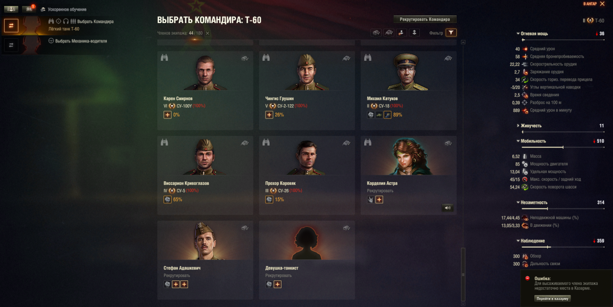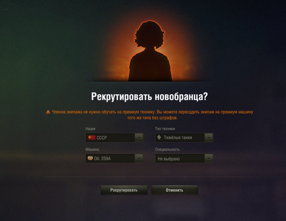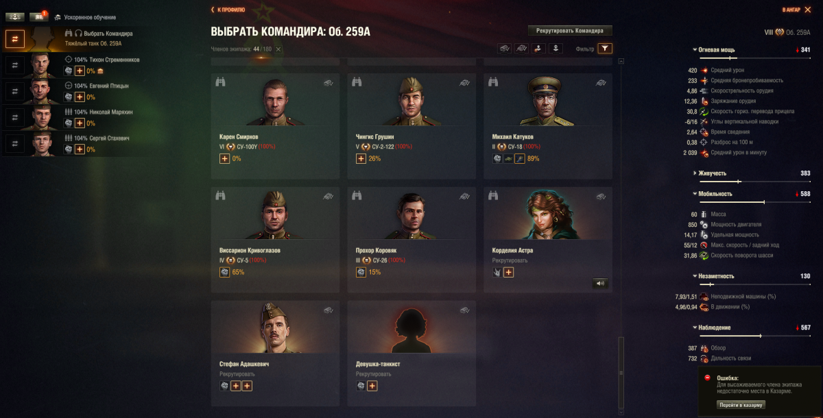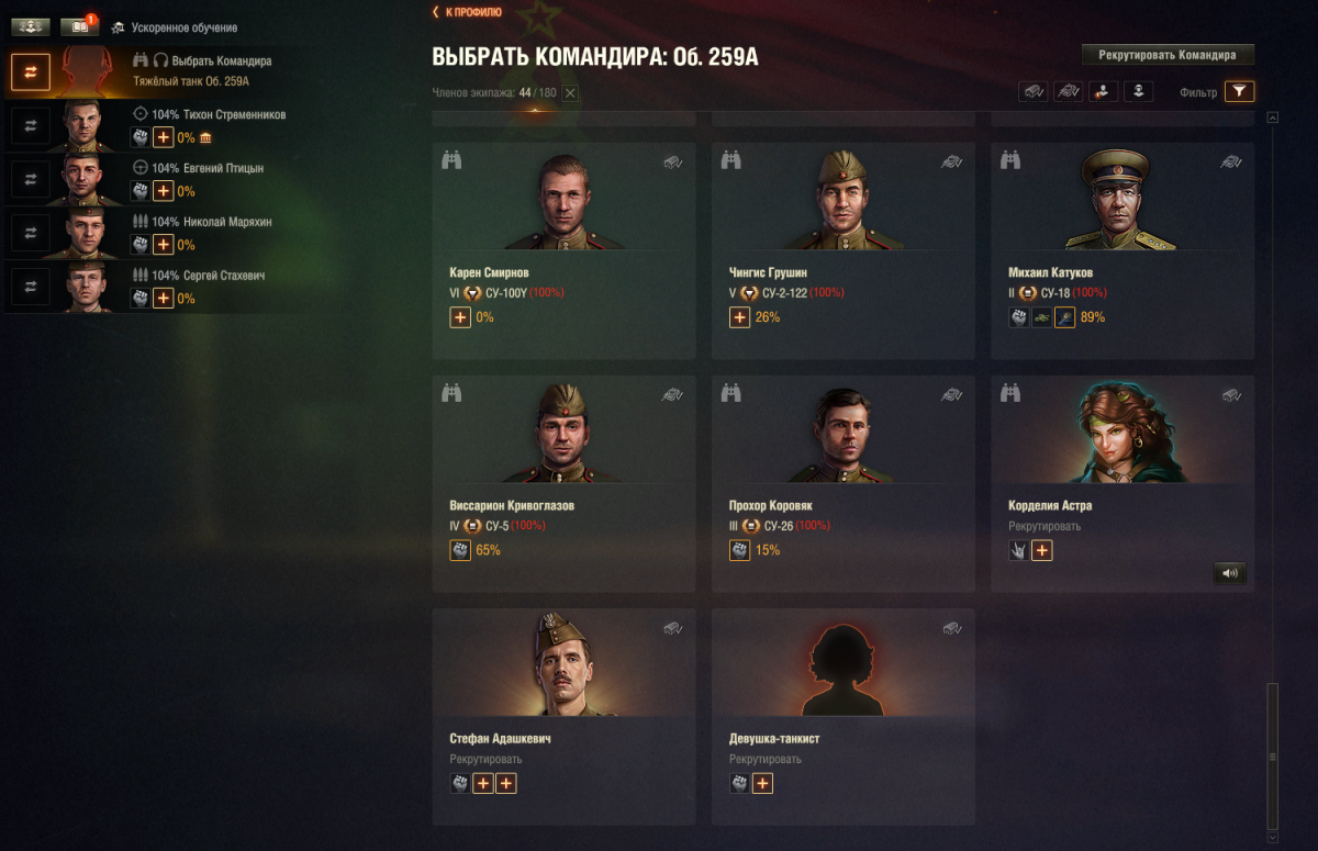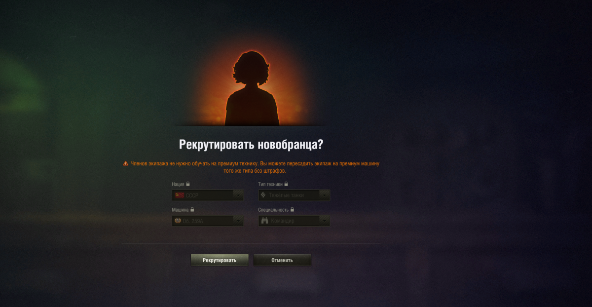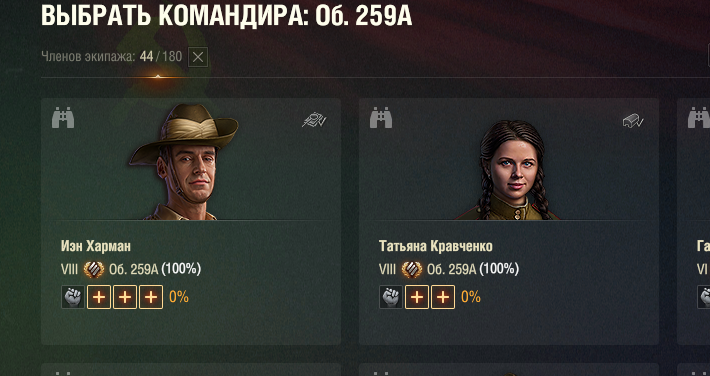 Воооот. Вот, что надо было этим чудикам изначально мне посоветовать. В общем, так. При выборе вручную нации и танка эта девочка превратилась в Татьяну Кравченко. Командира 259А. Но осталась в казарме. Сейчас посажу. только вот они всё равно виноваты на тему того, что мне придется сбрасывать хартмана за золото, ибо не подсказали. Вообще мышей не ловят, только оскорблять умеют и требовать почистить казарму. Спасибо огромное!