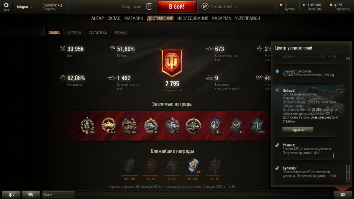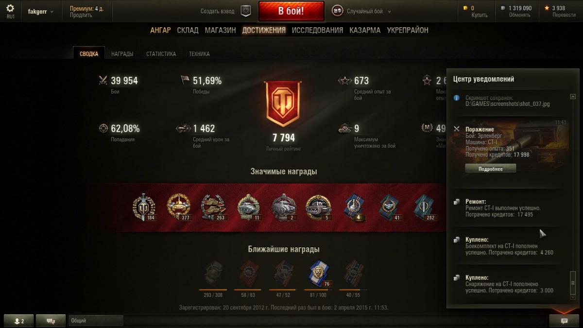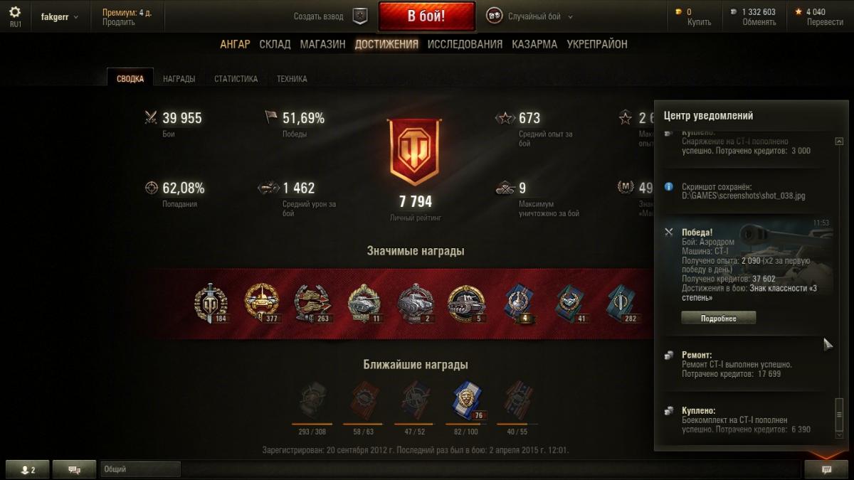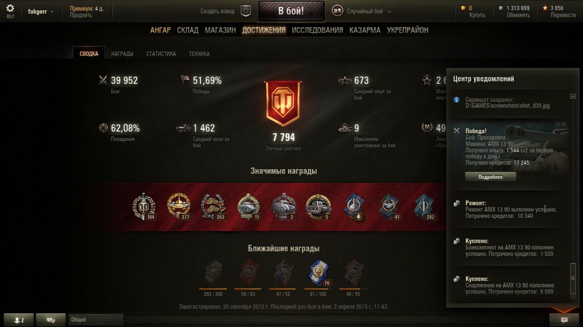 4. Возникла проблема, не знаю, что и думать... После обновления 9.6 стал замечать, что иногда не засчитываются в общий "стаж" целые серии побед. Пример: Вчера сыграл за день 74 боя, из них 41 - победы и 33, соответственно, - поражения. "общий процент побед" как был 51,69% за 40 тыс. боёв, так и остался в итоге, и непонятно: а куда делись мои 8 "чистых побед" ? В процессе игры получалась интересная динамика: счёт поднимался до 51,7% два раза, но только после 9 побед подряд, а после 4 поражений снова опускался до 51,9%. Такое происходит, к счастью, не каждый день, но, к сожалению, не первый раз. Грешил на свой клиент - сносил его с компа и устанавливал заново, но не помогло... Так вот вопрос: что это за баг и как его победить ? Помогите кто может плиз !!!