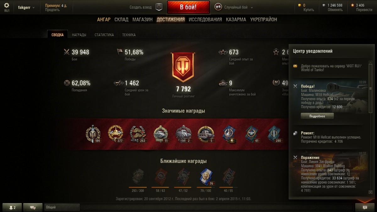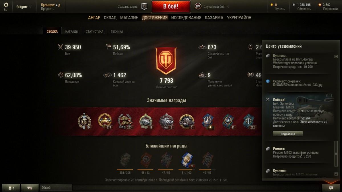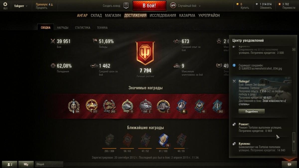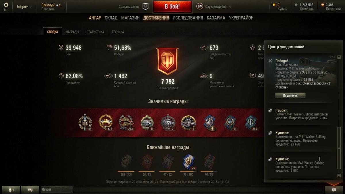 4. Возникла проблема, не знаю, что и думать... После обновления 9.6 стал замечать, что иногда не засчитываются в общий "стаж" целые серии побед. Пример: Вчера сыграл за день 74 боя, из них 41 - победы и 33, соответственно, - поражения. "общий процент побед" как был 51,69% за 40 тыс. боёв, так и остался в итоге, и непонятно: а куда делись мои 8 "чистых побед" ? В процессе игры получалась интересная динамика: счёт поднимался до 51,7% два раза, но только после 9 побед подряд, а после 4 поражений снова опускался до 51,9%. Такое происходит, к счастью, не каждый день, но, к сожалению, не первый раз. Грешил на свой клиент - сносил его с компа и устанавливал заново, но не помогло... Так вот вопрос: что это за баг и как его победить ? Помогите кто может плиз !!!