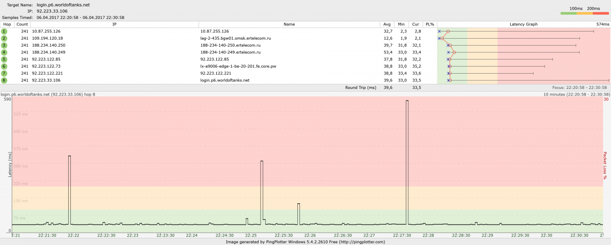 Проблема началась с версии 1.13. 1. Зависает клиент наглухо, приходится закрывать окно и снова заходить. С новым обновлением случаи участились. Ещё вариант - это дикий фриз и резкая просадка ФПС с 90 до 10. 2. г. Южно-Сахалинск, провайдеры: ООО Солнце ТВ, ООО "Мегафон" 3. Выполнил все требования по устранению лагов: прописал все порты, убрал галочки командирской камеры. ПингПлоттер говорит, что просадка пинга происходит на стороне вашего сервера до 2000 мс 4. Отчёты прилагаю. WoT_report.wgc 972,96К Documents.rar 49,74К - тут файлы PingPlottera