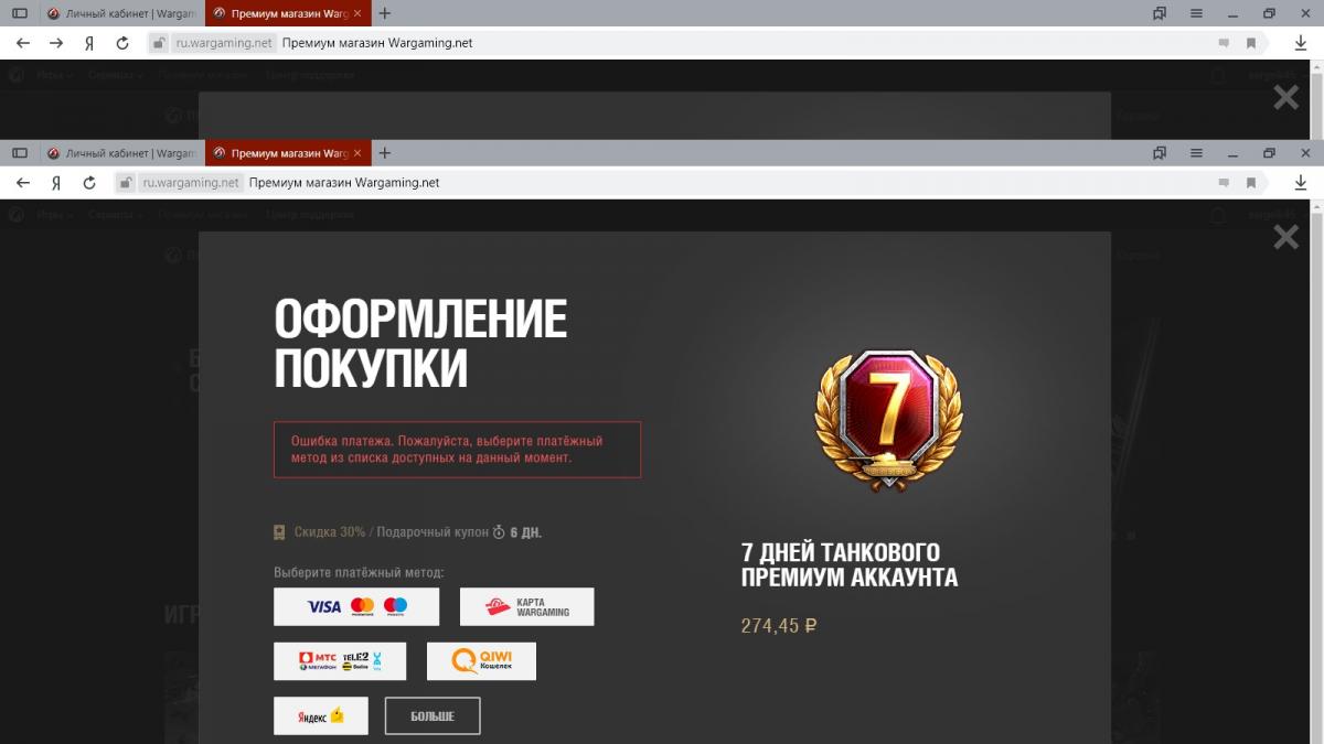 доброго времени суток . проблема такая , решил использоваться купон который дает скидку 30 проц и приобрести танковый премиум на 7 дней , Выбрал использование купона --, дальше перешел к оплате через карту , возникли проблемы с интернетом , решил оплатить через телефон , делаю назад что бы выйти в меню выбора оплаты , А уже купона нет , как так ? по факту я его не использовал , а он куда то делся ,..
