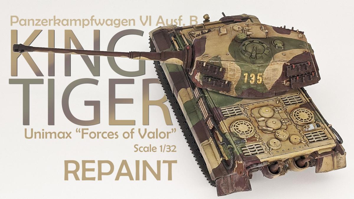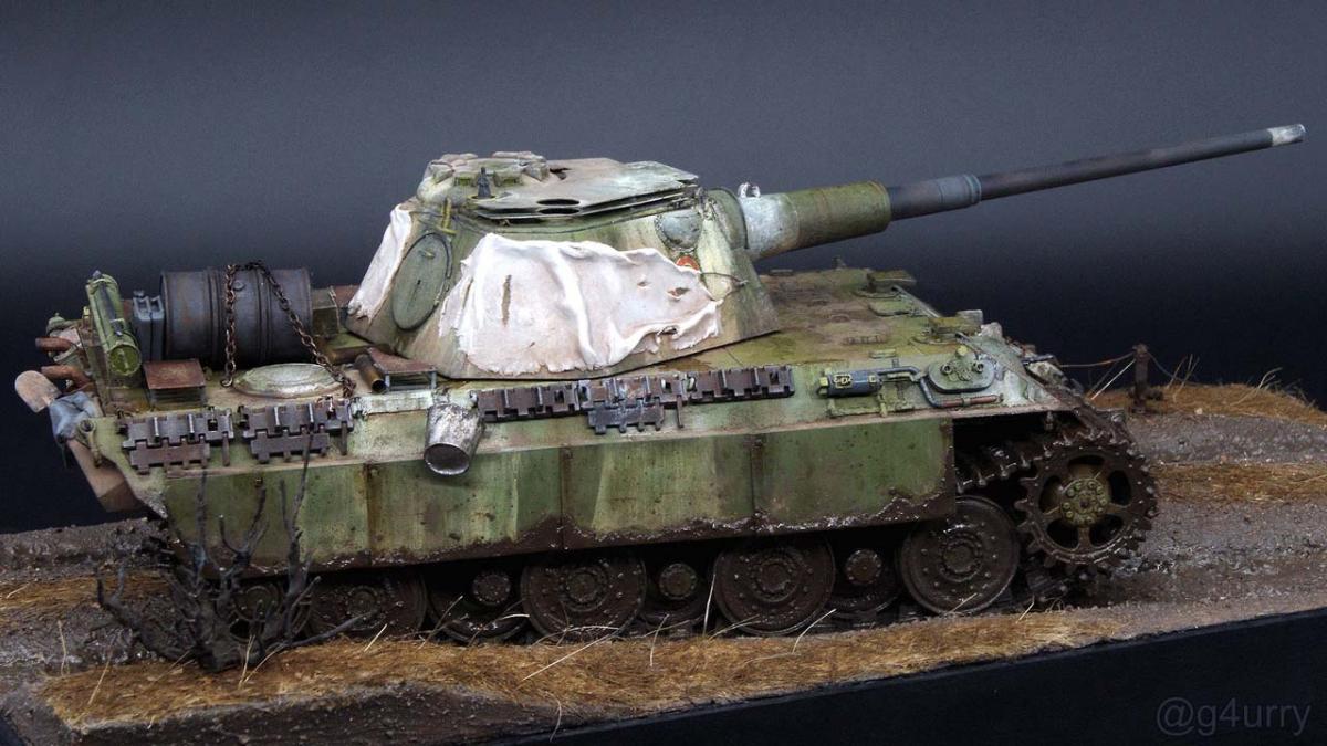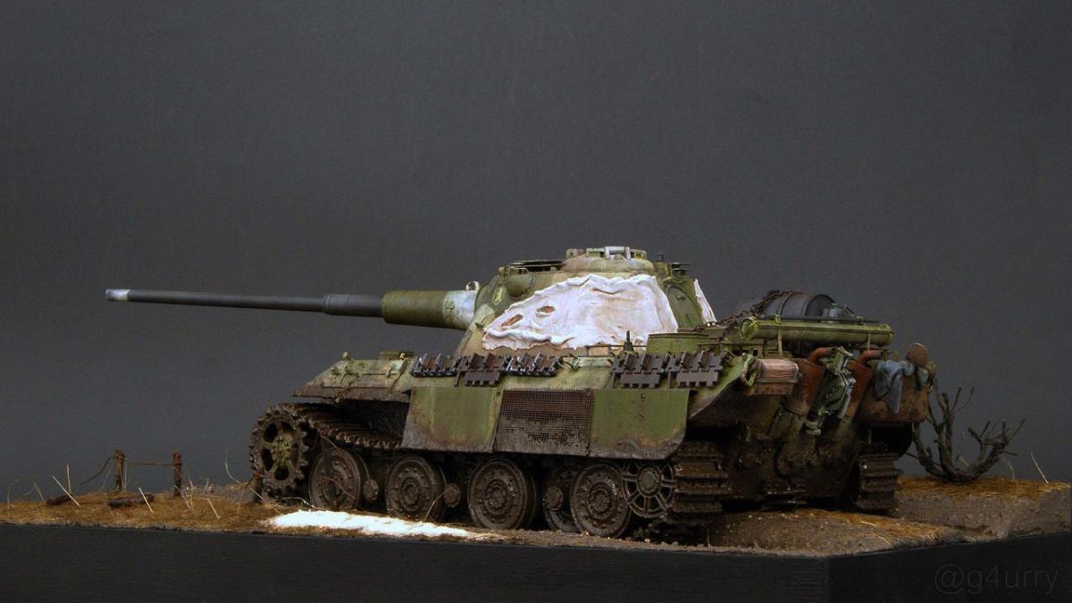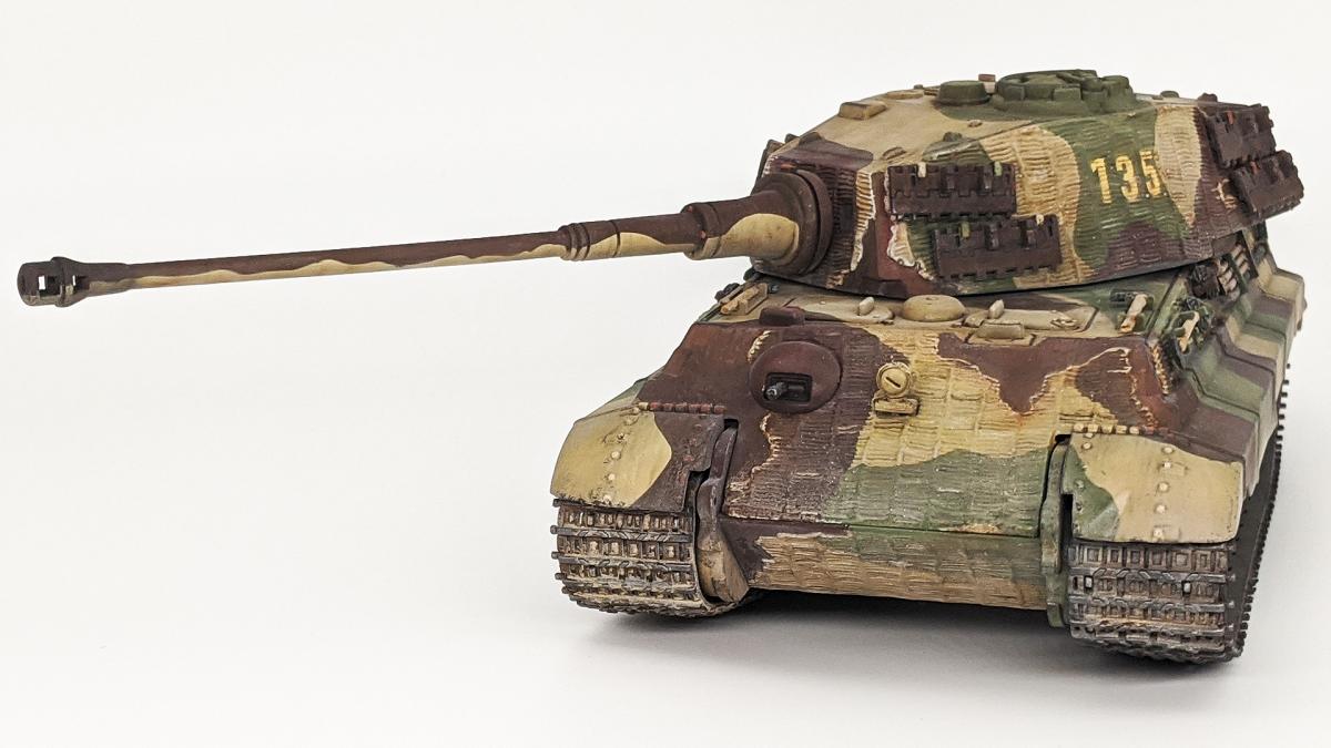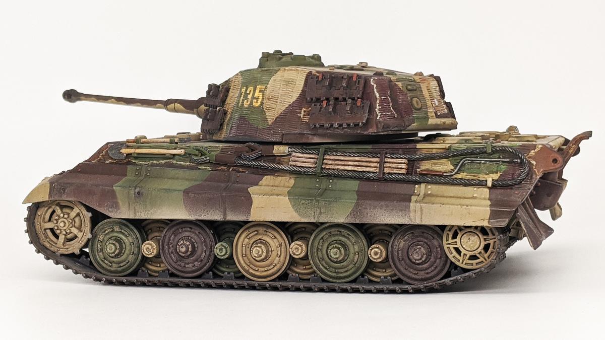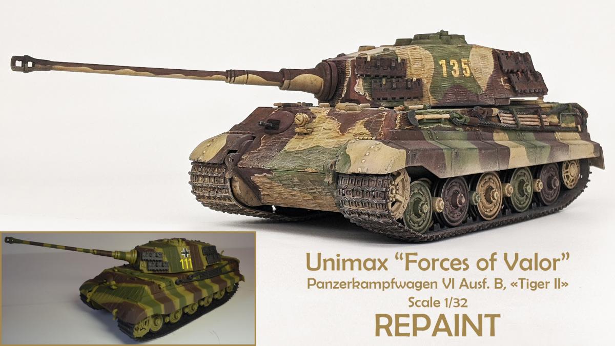 Перекрасил diecast игрушку Тигра II от Unimax. Неплохая для игрушки деталировка была испорчена фабричной покраской и мозолила мне глаза. Поэтому совместил приятное с полезным - успокоил нервы более симпатичным видом модельки и потренировался в покраске и тонировке циммерита.