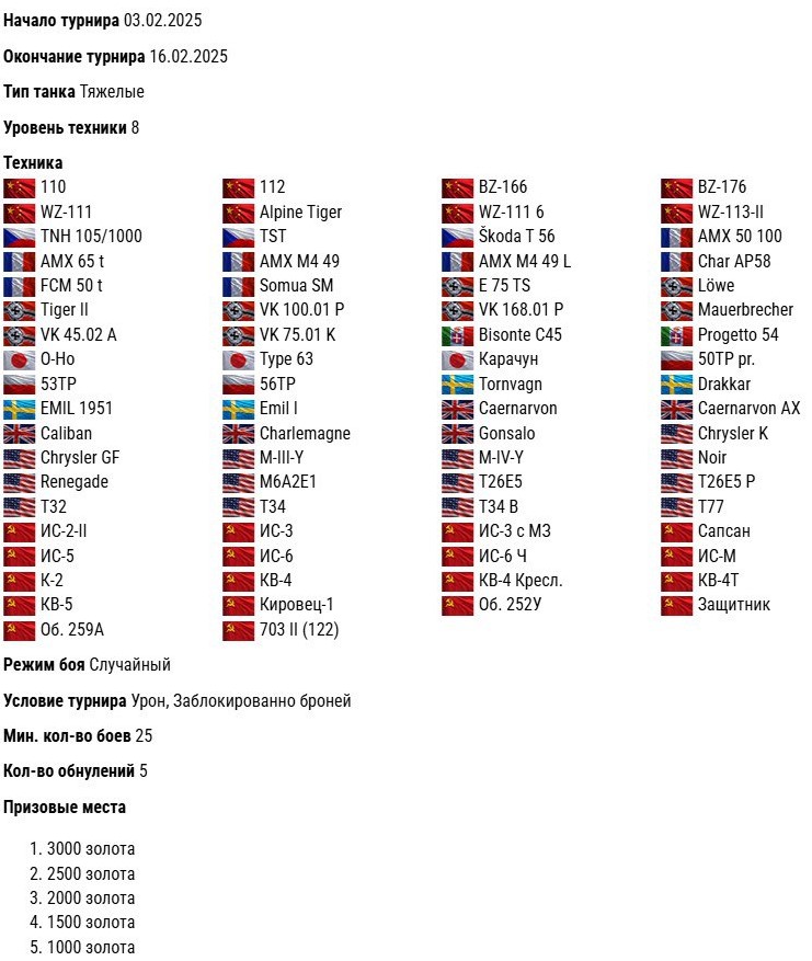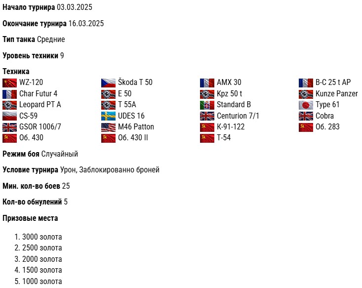 Привет танкисты! Скоро начало мартовского турнира. (https://tankbrothers.ru/tournaments/67c0672f0abd5a907a943273) https://forum-mt-prod.lesta.ru/monthly_02_2025/post-93688142-0-88605000-1740748044_thumb.jpg Всем удачи! Присоединяемся к нашему телеграмм каналу (https://t.me/tankbrothers)
