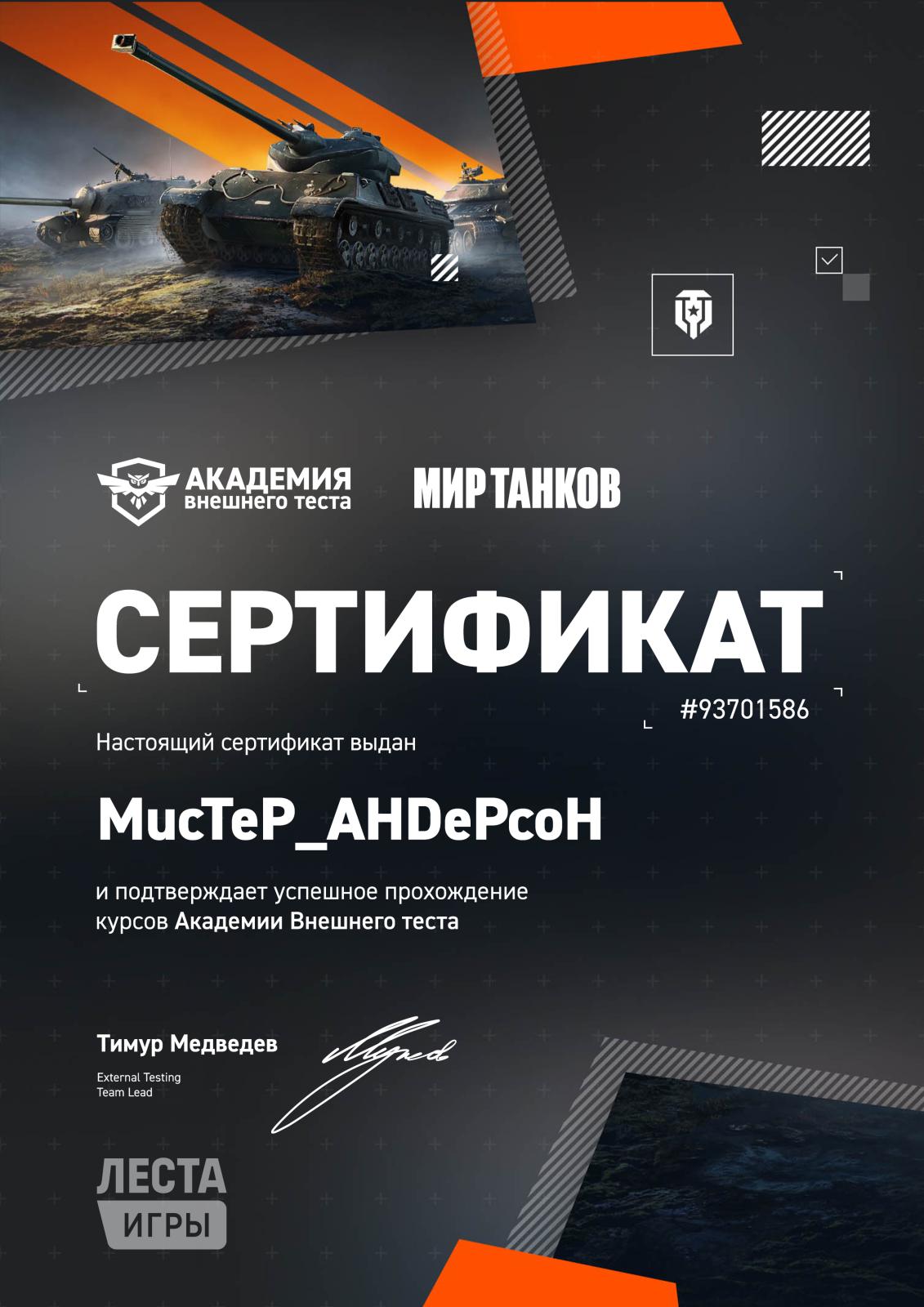 1. Номер сертификата 93701586 2. Тестировал игру от компании WG Project CW 3. Я хочу попасть на супертест для того, что бы действительно заниматься тестированием техники, механик, карт и других активностей данной игры, не отбывать место супертестера (которых полно в клане супертестеров с известным клантегом)за декали и танк, а именно скрупулёзно заниматься тестированием всех активностей, которые появляются в игре, так как есть очень много вопросов к тем тестерам, которые играют на технике с пометкой "Т" в лучшем случае 10 боев и имеют крайне низкую статистику по аккаунту, соответственно опираться на мнение таких тестеров категорически невозможно! Считаю, что тестер должен откатать минимум 100 боев на технике с различными вариантами оборудования, для того чтобы дать оценку танку! Особое внимание я бы хотел уделить проблемам балансировщика и ребалансу старой техники, которая в игре существует давно и не вписыватся в современные реалии "рандома"! 4. 20.00-22.00 5. Не являюсь волонтёром другой группы проекта Мир Танков. Отказ. Причина в ЛС P.S. было бы желание, а найти всё можно (я про форму заявки)