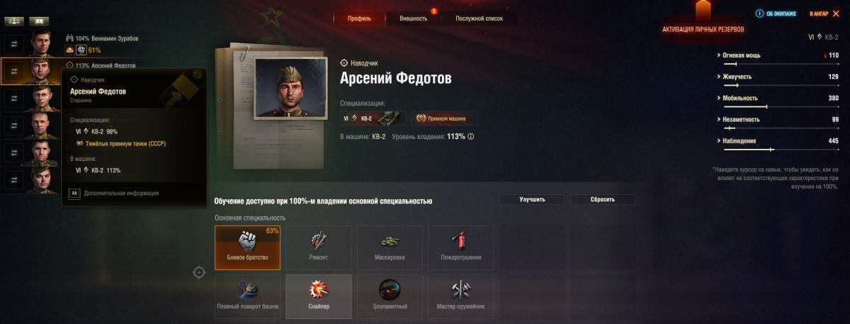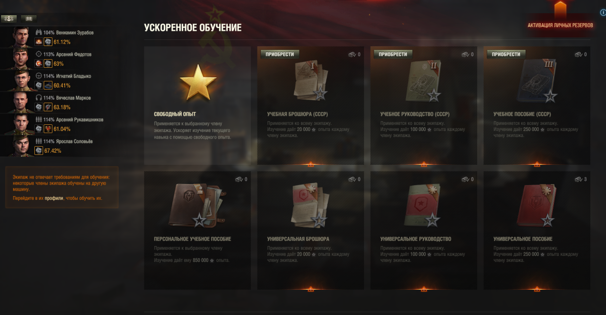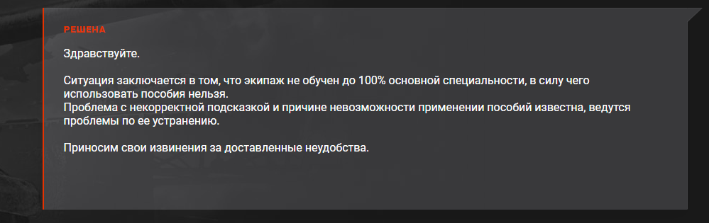 Короче, так. В тему вопросов разработчикам я написать не могу, <500 боев. А зря. Есть, куда носом ткнуть. С какого перепуга происходит вот такая фигня: 1 скрин. Я не могу применить учебник, ругается, мол, не все члены экипажа обучены на танк. А вот нет. Все обучены на этот танк, у каждого перки изучаются. 2 скрин. При рассмотрении под лупой выясняется, что у одного члена экипажа, с полутора перками, 99% владения основной специальностью. Ага. 99% при полутора перках, которые вообще невозможно получить без 100% владения основной специальностью. Это не штраф никакой. 3 скрин. После боя, этот самый член экипажа достигает 100% владения основной специальностью, помимо его полутора перков. Учебники становятся доступны для применения. Интернет мой, наверное, медленный, вся эта беда лишь поэтому, никто из программистов ни в чем не ошибся, да?