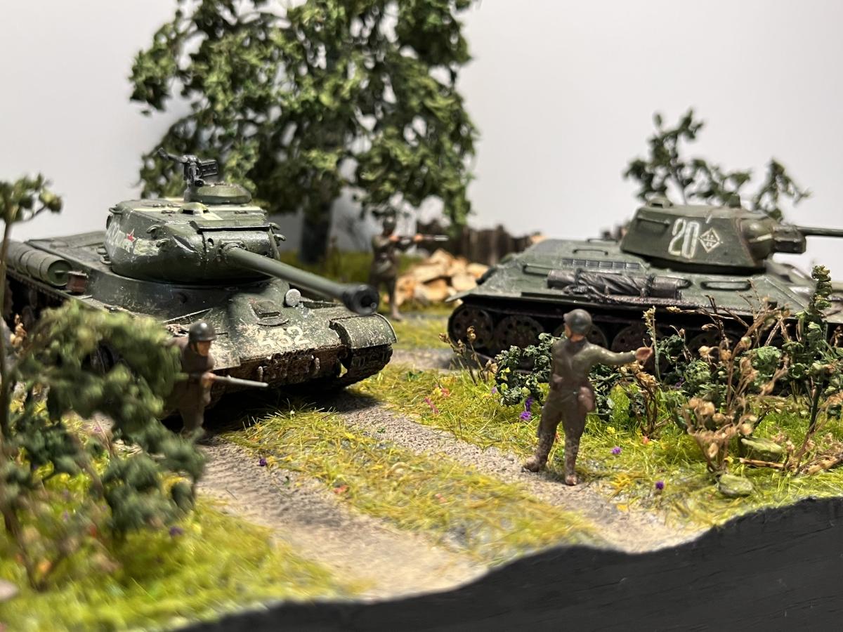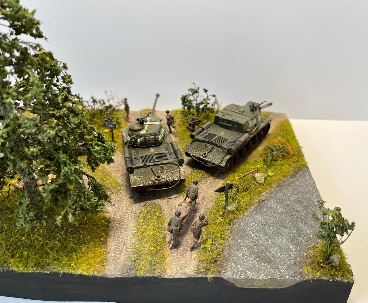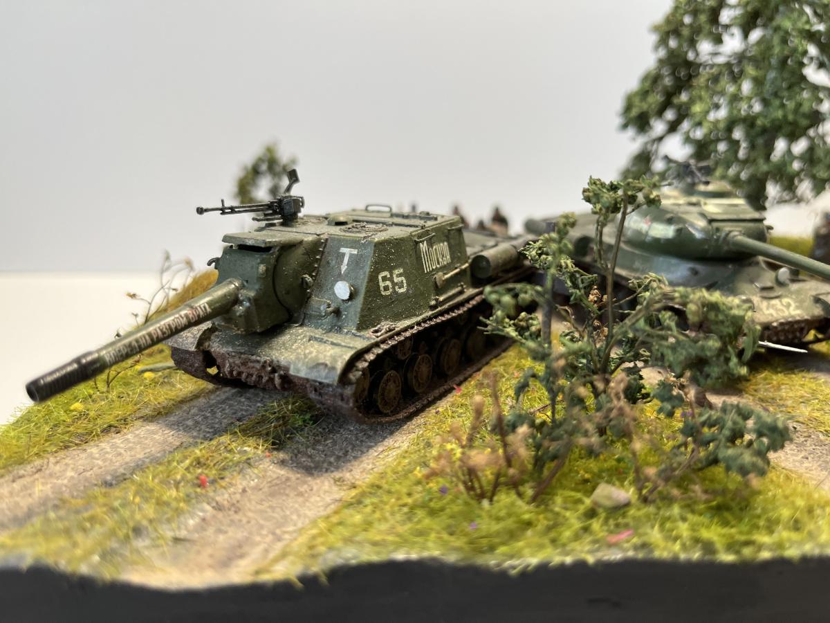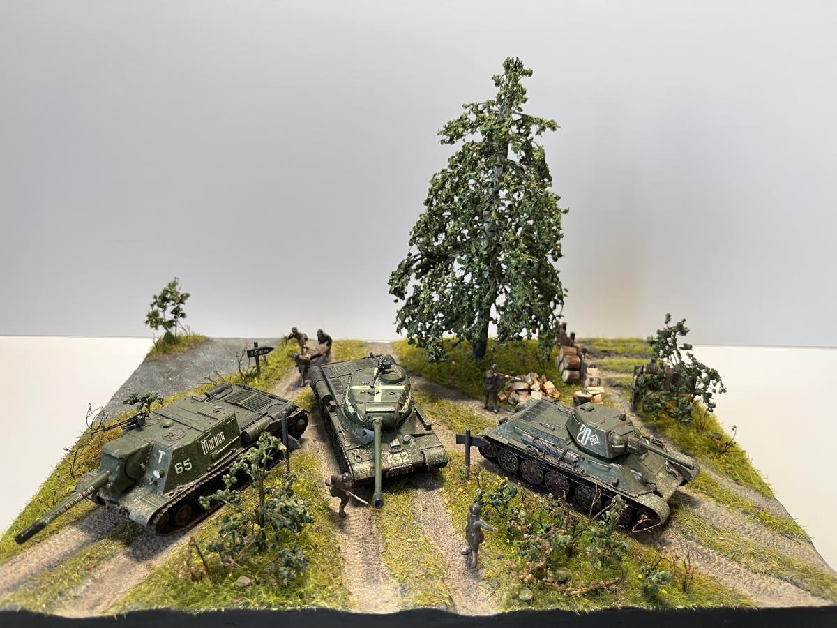 Первая полноценная диорама - "Возвращение с победой". Танки Т-34/76, ИС-2, ИСУ-152, солдаты - "Звезда", 1/72, с небольшими доработками (отверстия в дулах, тросики из медной проволоки для Т-34, брезент); Покраска - где-то "Tamiya", где-то "Звезда"; Река из эпоксидки; Дерево: ствол сделал из китайской палочки (немного надломил в нескольких местах для придания более кривой формы), обмотал салфеткой на ПВА для коры, просверлил дырочки и вставил веточки из травы, которую на улице нашел, листья из сушеной петрушки (немного подкрасил зеленым, чтобы не выцветали)