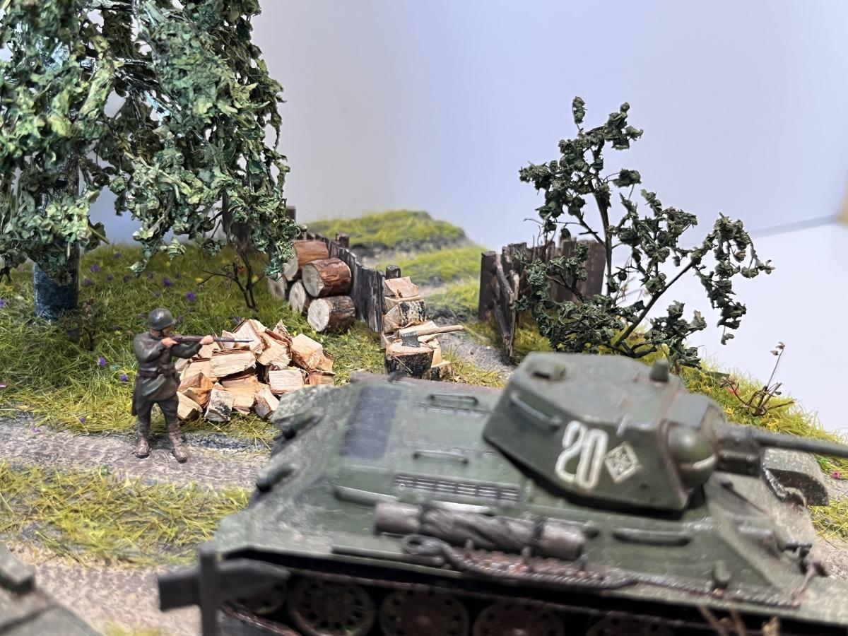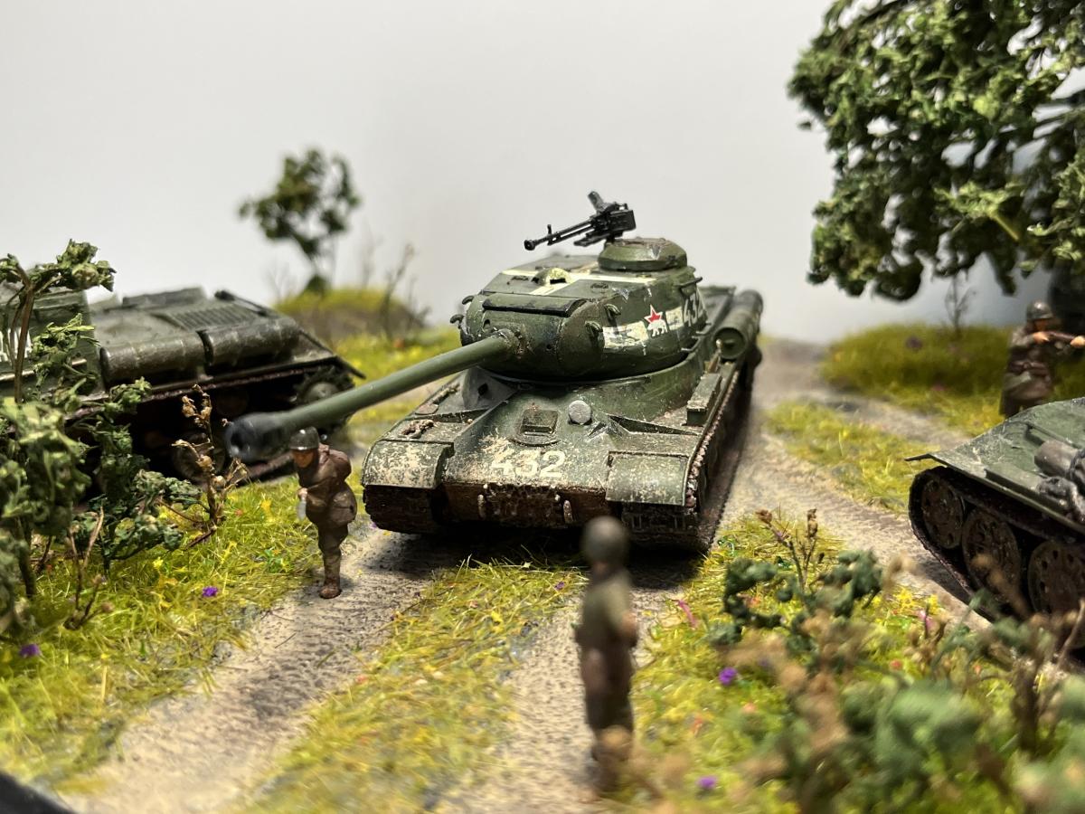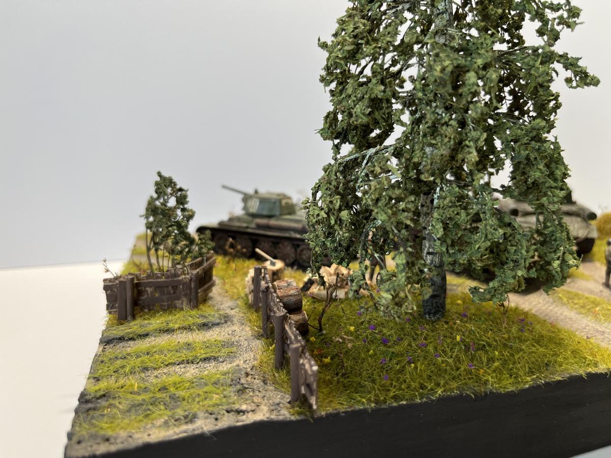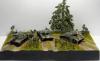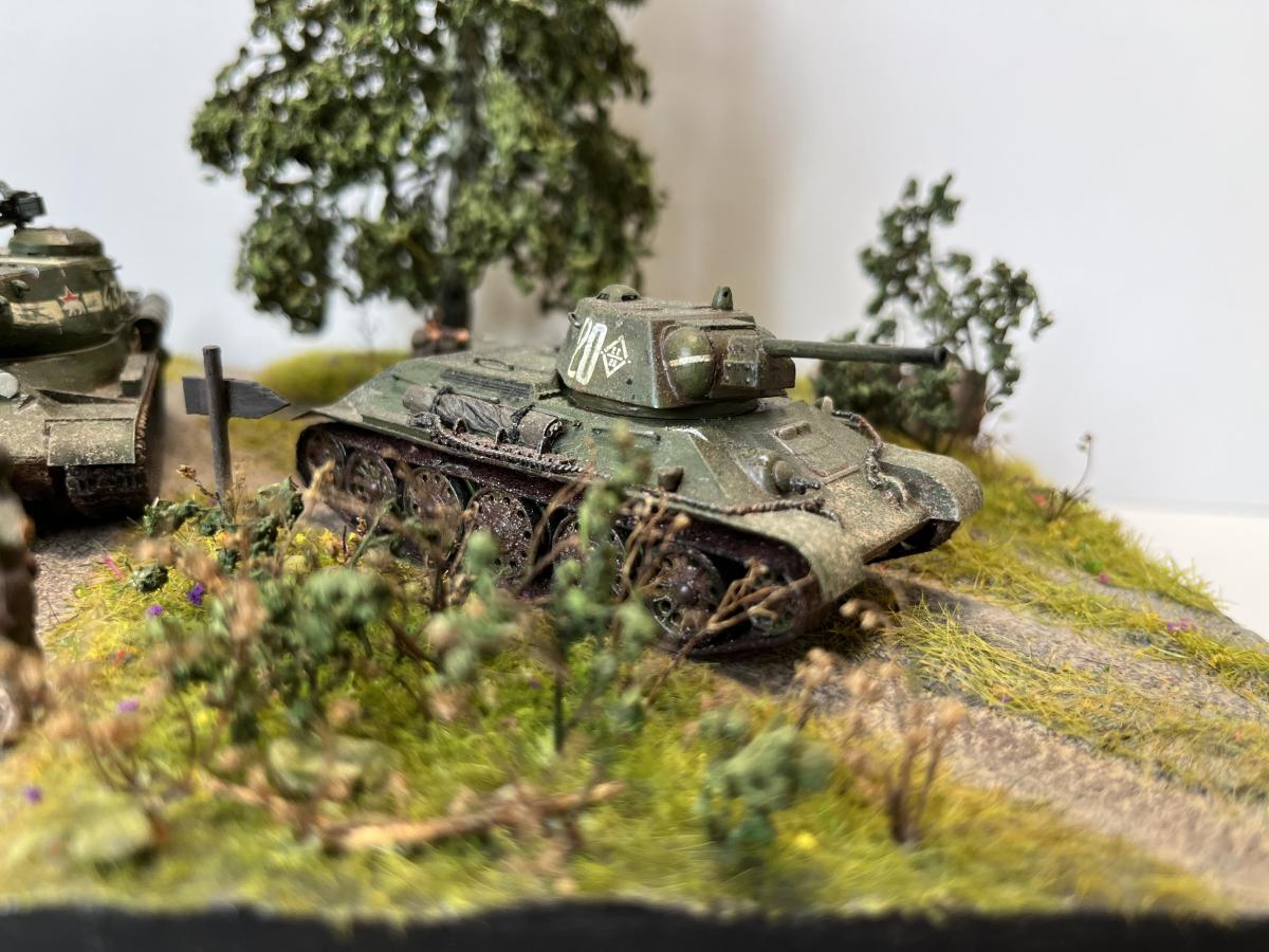 Первая полноценная диорама - "Возвращение с победой". Танки Т-34/76, ИС-2, ИСУ-152, солдаты - "Звезда", 1/72, с небольшими доработками (отверстия в дулах, тросики из медной проволоки для Т-34, брезент); Покраска - где-то "Tamiya", где-то "Звезда"; Река из эпоксидки; Дерево: ствол сделал из китайской палочки (немного надломил в нескольких местах для придания более кривой формы), обмотал салфеткой на ПВА для коры, просверлил дырочки и вставил веточки из травы, которую на улице нашел, листья из сушеной петрушки (немного подкрасил зеленым, чтобы не выцветали)
