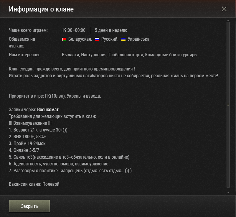 Клан ищет бойцов или костяк роты или роту на ЗП на ивент! Для бойцов на ЗП стата : от зелени(Ласты фиолет) чиф 907 в ангаре. Для бойцов не на ЗП (от Бирюзы) топы не важны.По всем вопросам обращайтесь в ЛС в игре.Заявку на вступление в клан вы можете оставить по ссылке https://ru.wargaming.net/clans/wot/522977/