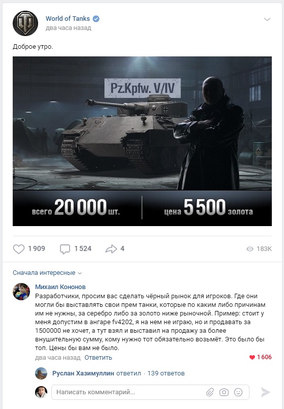 Здрасте танкисты и разработчики игры! 23.05.2019 Разработчики игры выкатили "черный рынок " Скажу честно не совсем удачно, больше негатива было от "долой правила" а это: 1. Долго заходило на сервер или вкладку магазин/черный рынок, из-за нагрузки наплыва игроков. 2. При совершении покупки: а) У Вас сбрасывало операцию с сообщением: "Ошибка: Техническая ошибка совершения платежа. Пожалуйста попробуйте попозже"; б) У Вас висел элемент загрузки "Покупка" в течение 3-4мин; В обоих случаях танк неуспевали купить. Но есть и плюсы у этого режима: повышенный интерес и рост онлайна в момент продаж. Критикуешь - Предлагай! А что если Мы сделаем внутриигровой рынок??? Чем мы хуже металлолома Cro***ut ? Итак: 1.Режим доступен в определенное время недели или месяца. 2.Участие на рынке небольшая плата в золотой игровой валюте; 3.Разные режимы торговли от аукционов до vip-сделок и передачи танка в аренду (между игроками); 4.Клиент игры (подрядчик WG) должен получать 5-20% от всех сделок. Согласитесь есть где развернуться идеям. Среди VK комментариев танкистов наткнулся на интересное сообщение молодого человека: Михаил Кононов: "Разработчики, просим вас сделать чёрный рынок для игроков. Где они могли бы выставлять свои прем танки, которые по каким либо причинам им не нужны, за серебро либо за золото ниже рыночной. Пример: стоит у меня допустим в ангаре fv4202, я на нем не играю, но и продавать за 1500000 не хочу, а тут взял и выставил на продажу за более внушительную сумму, кому нужно тот обязательно возьмёт. Это было бы топ. Цены бы вам не было" - конец цитаты. К сведению : всего за час это сообщение собрало около 1 600 лайков и 130 ответов. Долой Черный рынок - даешь Танкорынок! Друзья танкисты, разработчики игры и артоводы Напишите как Вам идея и что бы Вы добавили или убрали с этого режима. Всем спасибо за Внимание и удачи на полях сражений! шибка совершения платежа. Пожалуйста, попробуйте позже