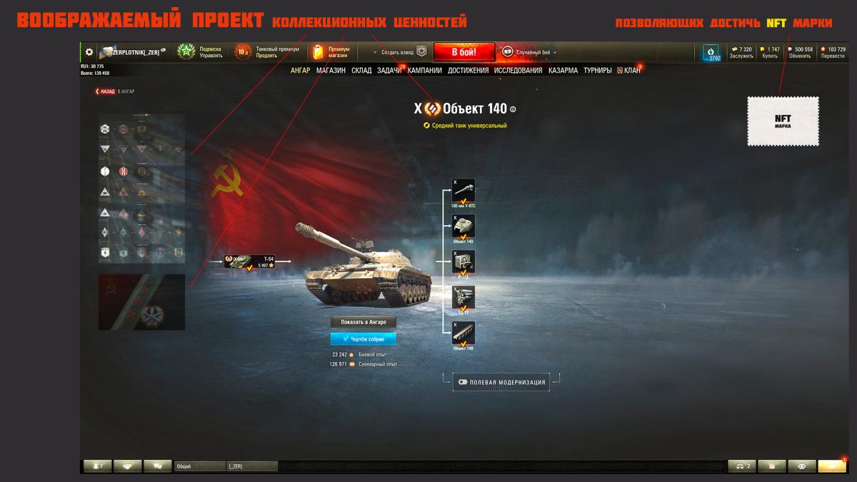 Хочу предложить новую сущность — NFT-марку, являющаяся важной частью будущей коллекции.(можно прослушать) Что это такое? Это марка (по аналогии с филателией) с NFT свойствами. Такая марка, в моём случае, может выполнить одно из важнейших условий коллекционирования — у коллекции появляется собственник.Марка не влияет на игровое имущество и игровую механику. Она представляет самостоятельную сущность и фиксирует событие по аналогии с фотографией или скрином. В дополнение, предоставляет особые условия в игре для её владельца. Полноценной коллекцией можно считать только ту, где достигнуто три основных пункта, а это: Первое — наличие предмета коллекции;Второе — коллекционная ценность у предмета коллекционирования;Третье — у предмета коллекции есть собственник (NFT фиксация, в моём случаи марка). Как достичь статуса коллекционера?Необходимо приобрести предмет коллекционирования (танк).Придать ему коллекционную ценность, то есть заслужить игровые достижения, а это: все этапные декали и отметки на стволах.Перед этим прокачать танк до элитного. У экипажа сто процентный навык плюс пять дополнительных (только для танков из веток развития и "коллекционная" ). Выполнив вышеперечисленные условия, игроку вручается NFT-марка и фиксируется достижение — предмет коллекции с коллекционной ценностью.Оформление NFT-марки может быть разнообразным, от стандартной до индивидуальной с привлечением сертифицированных художников. Коллекционная ценность может быть разной, в зависимости от дополнений: кто достиг результата, какое игровое имущество было на момент фиксации достижения (камуфляж), члены экипажа, как и кем оформлена марка. Разная степень коллекционной ценность позволяет устанавливать стоимость марки на аукционе. Таким образом, игрок получает серию NFT-марок и собирает коллекцию по принятой традиции сообщества коллекционеров и определяемой игрой.Собрав коллекцию, присваивается нашивка и звание коллекционер.Собрав установленное количество нашивок, присваивается шеврон с правом получения платного курса подготовки экипажа (оплата один раз месяц).У каждого шеврона разное количество коллекций от трёх и выше. Всего шевронов восемь с учётом нулевого. Нулевой — когда собрана вся техника из веток развития и "коллекционная", но не выполнены условия приобретения статуса коллекционера. Коллекций может быть большое количество. К примеру, это: уровни танков, нации, только лёгкие советские, "коллекционные" или все находящиеся в игре и т.д. и т.п. См. картинку. Дополнительная возможность — NFT-марка по завершению сбора коллекции и получения нашивки, должна давать право доступа к особому магазину.У каждой коллекции своя коллекционная ценность и свой уровень магазина.Такое достижение, назову его "коллекционер", открывает другой путь приобретения игрового имущества. Не все игроки могут активно участвовать в игровых событиях и не все имеют высокий уровень владения "танком".Коллекция марок может открыть возможность для такой категории игроков. Вместе с NFT-маркой открывается возможность её продавать, передавать, дарить и обмениваться. Так как она является собственностью "коллекционера".То есть, появляется новый процесс в самой игре. Что это даёт? У игроков с высоким игровым навыком есть возможность получить NFT-марку и реализовать её на торговой площадке, п