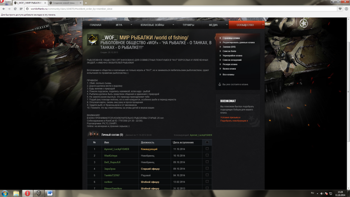 [_WOF_] МИР РЫБАЛКИ /world of fishing/ производит открытый набор по всем вакантным категориям.Ссылка на страницу клана: - http://worldoftanks.ru/community/clans/104070/#wot&mt_order_by=member_since РЫБОЛОВНОЕ ОБЩЕСТВО ОРГАНИЗОВАНО ДЛЯ СОВМЕСТНЫХ ПОКАТУШЕК В "WoT" ВЗРОСЛЫХ И УВЛЕЧЕННЫХ ЛЮДЕЙ, А ИМЕННО ЛЮБИТЕЛЕЙ РЫБАЛКИ! ПО РЕЗУЛЬТАТАМ НАБОРА ПЛАНИРУЮТСЯ: Командные и Ротные бои,а также Укрепоайон: сражения. Online: на вечерних и утренних зорьках ;-) ВНИМАНИЕ! !!! В КЛАН ПРИНИМАЮТСЯ ИСКЛЮЧИТЕЛЬНО РЫБОЛОВЫ СТАРШЕ 25 лет. КОНТАКТЫ: - DeD_KupuJlJl - maxdon79 - Aynred_LuckyFISHER