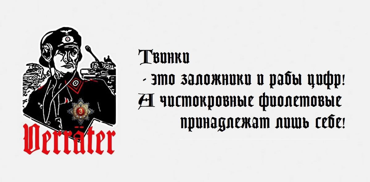 Цифры статистики говорят, что красных - 20%, оранжевых 40%, жёлтых - 30%, зелёных - 9%, голубых - 0,9%, фиолетовых - 0,1%! На это я Verräter скажу следующее: Нас - чистокровных фиолетовых не 0,1%, нас всего 0,01%! Твинки нам в подмётки не годятся! Мы свой фиолетовый цвет добыли честно в нубских страданиях, а голимые твинки свой фиолетовый цвет купили/продонатили! Мы играем, побеждаем и нагибаем в удовольствие, а твинки нервно бустят себе свои циферки (статку)! Твинки - это заложники и рабы цифр! А чистокровные фиолетовые принадлежат лишь себе! Так что твинки, не примазываейтесь к нам - чистокровным фиолетовым! Сколько бы вы не мазали себя фиолетовым цветом, он у вас всё равно будет с оттенками коричневой каки!
