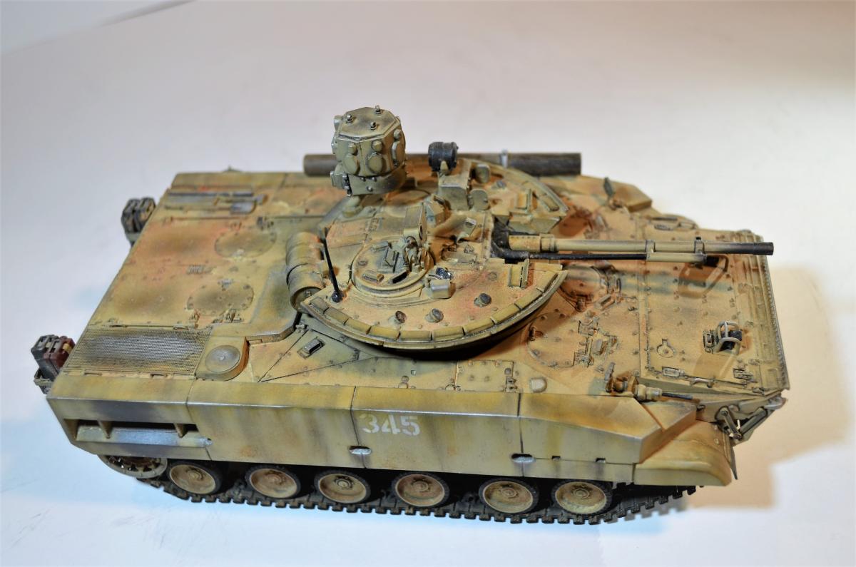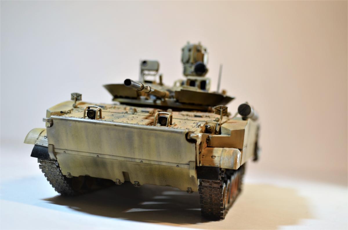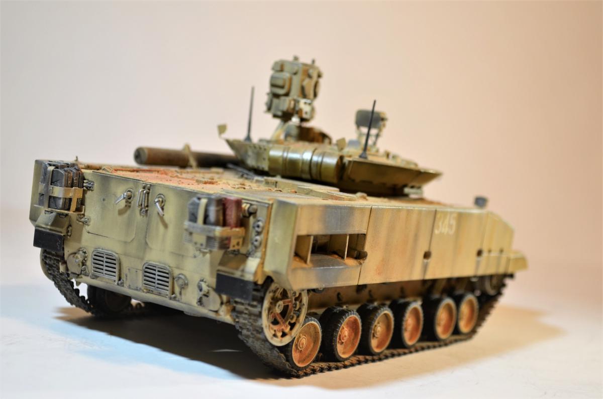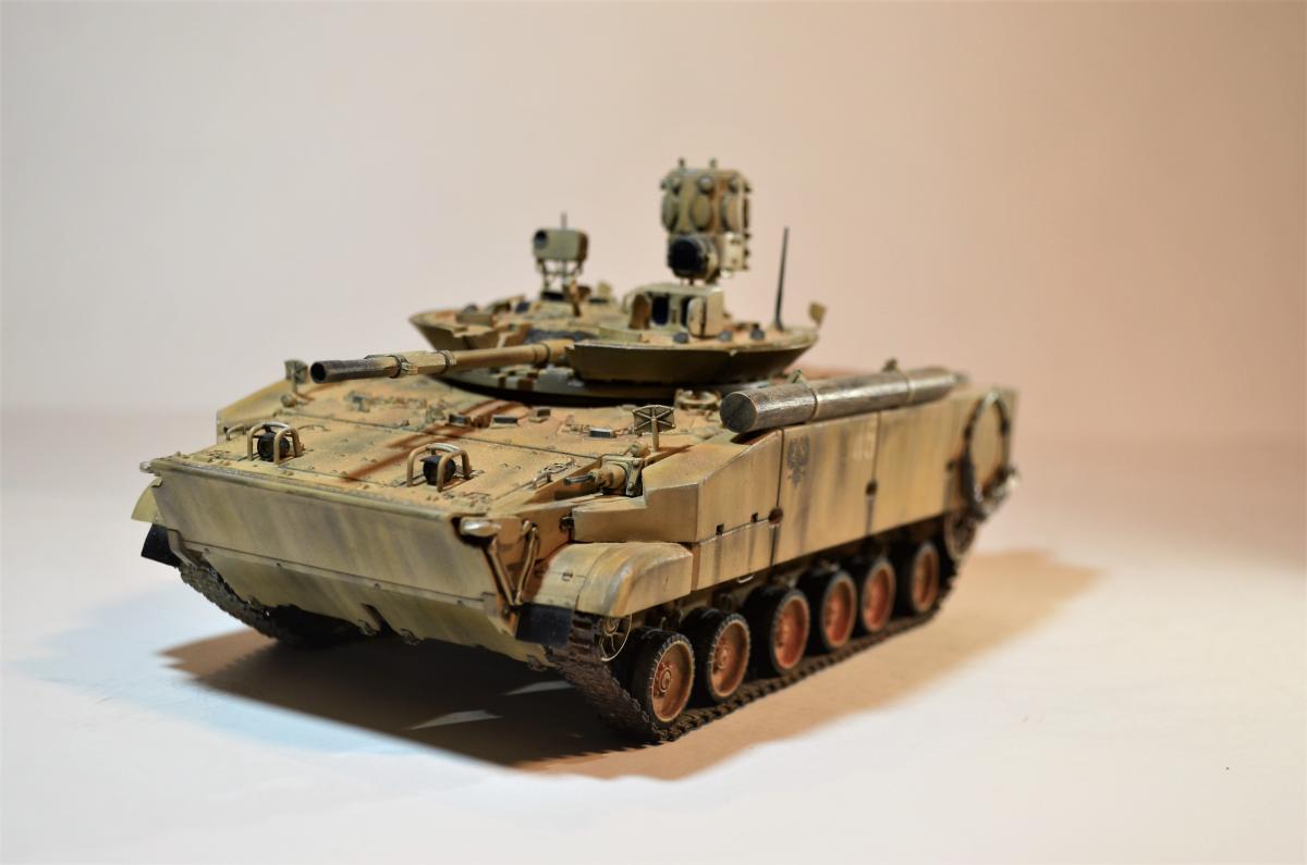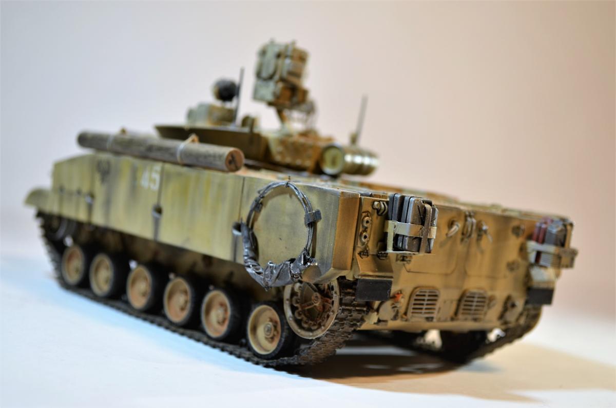 Привет, ребят! Пока идет моя доработка Об.263 , решил поделиться с вами еще одной моей далеко не новой моделью БМП-3М с Комплексом Активной Защиты "Арена". Очень нравится мне этот вариант данной машинки, поэтому решил его в свое время собрать. Если честно, это моя "проба пера", так сказать, в деле САМОПИЛА - это были мои первые шаги в работе с пластиком. Поэтому прошу не судить строго, было это давно и все только-только начиналось. Много писать не буду: аппарат практически весь изкоробочный + немного моего самопила + пластиковые рабочие гусли от MiniArm (по-моему так, если не ошибаюсь, если что, простите великодушно). Красилось и лакировалось, как всегда, Тамиевской аэрозолью. Наносились Тамиевские пигменты. Общая направленность модели - машина в условиях городского боя на Ближнем Востоке. Надеюсь на ваше снисхождение на мелкие косяки и недочеты. Всем удачи.